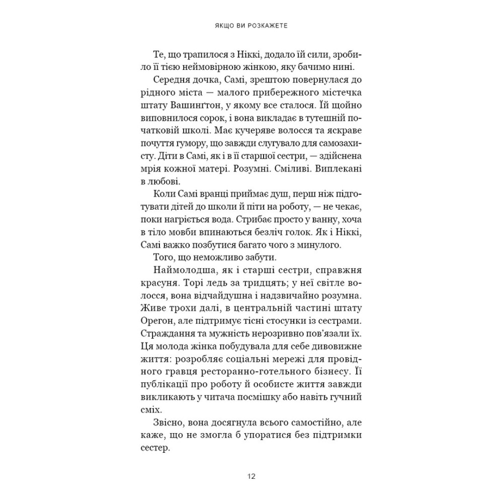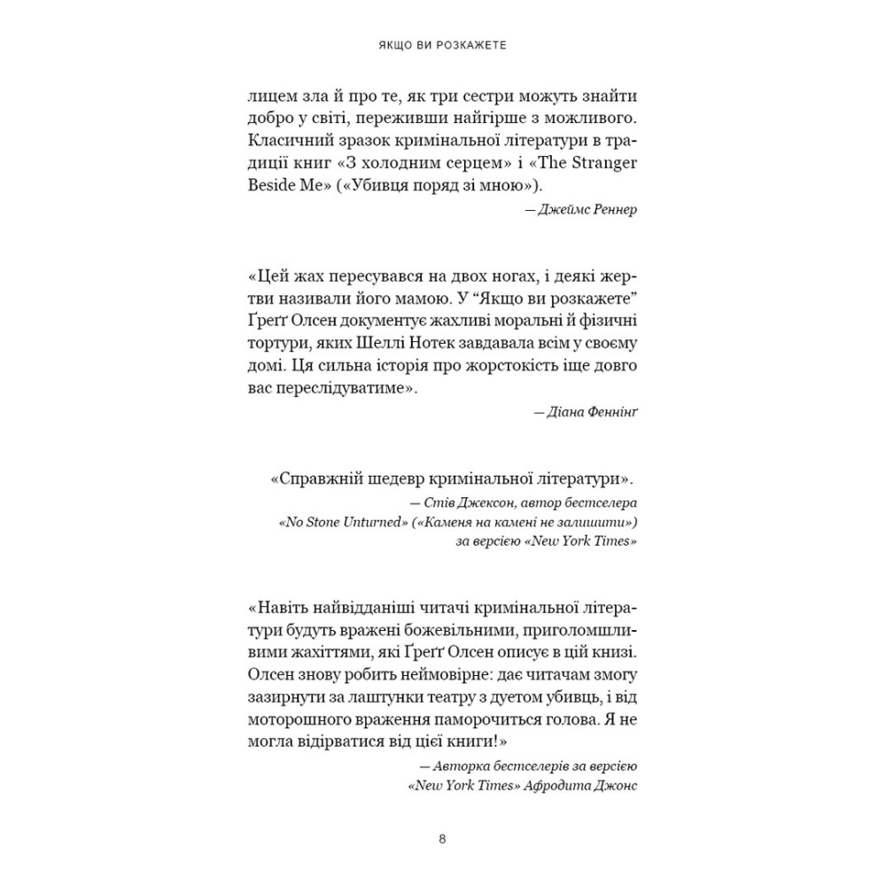 «Якщо ви розкажете. Реальна історія сестер, які виросли з матір’ю-вбивцею» — це психологічний трилер-сага від Ґреґґа Олсена про силу людського духу й силу сестринської любові перед неймовірними жахами, страхом і розпачем. Злочини, які скоюються в сім’ї за зачиненими дверима, — страшні й незрозумілі. Жертви часом навіть не замислюються, що їм можна й навіть потрібно звернутися по допомогу, бо бояться, що не отримають її. Домашнє насильство — як фізичне, так і психічне — те, про що воліють не говорити ані жертви, ані свідки. Сестри Нотек збагнули, що їхнє мовчання спричинило смерті інших людей, коли будо вже пізно, і їхня розповідь — своєрідне застереження іншим: не мовчіть!