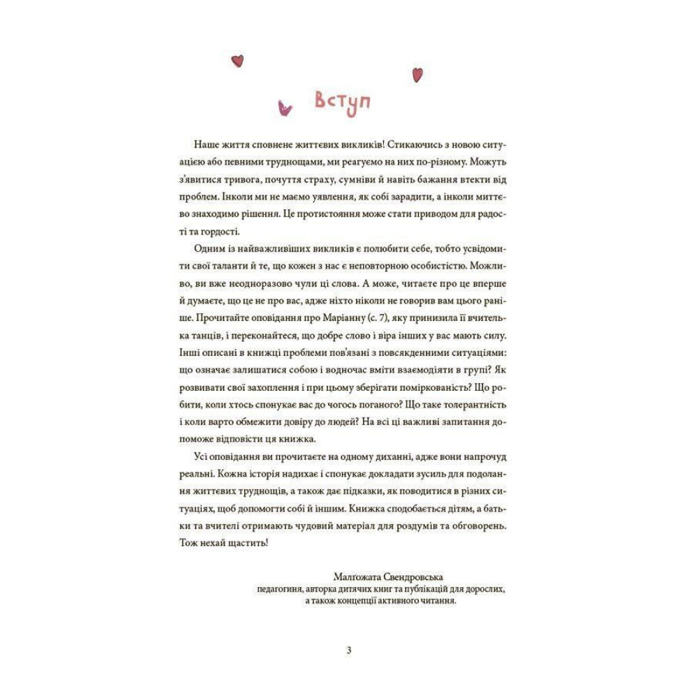 Це видання заохочує дітей говорити про власний досвід, емоції та переживання, а також стає чудовим приводом для розмов із батьками й учителями. Книга допомагає сформувати навички емоційної грамотності, підтримує у складних ситуаціях і сприяє впевненішому дорослішанню.