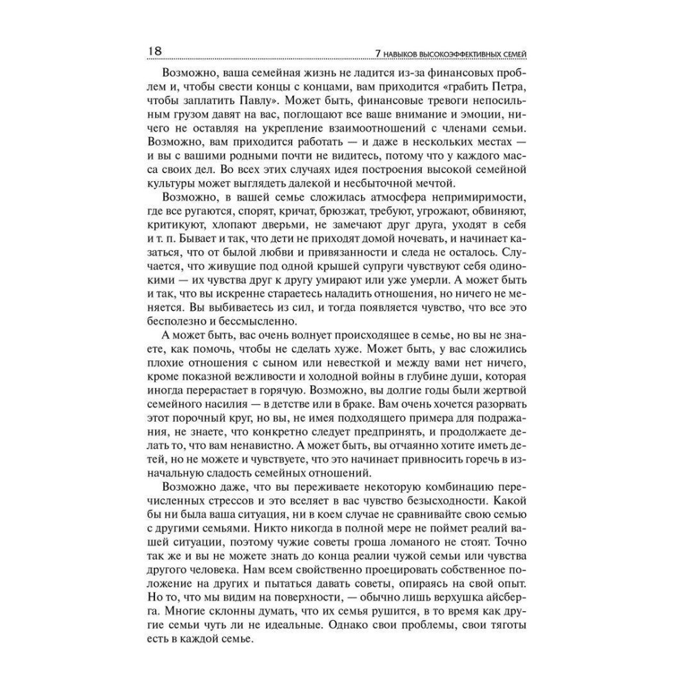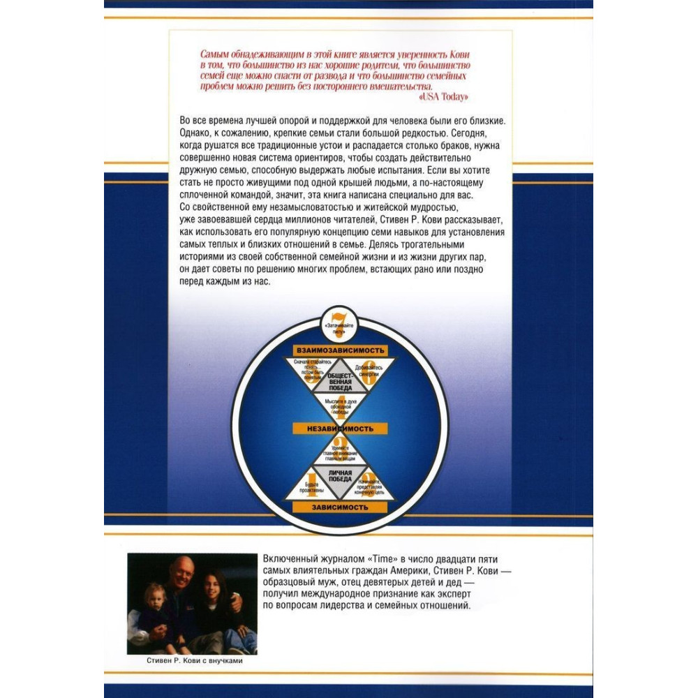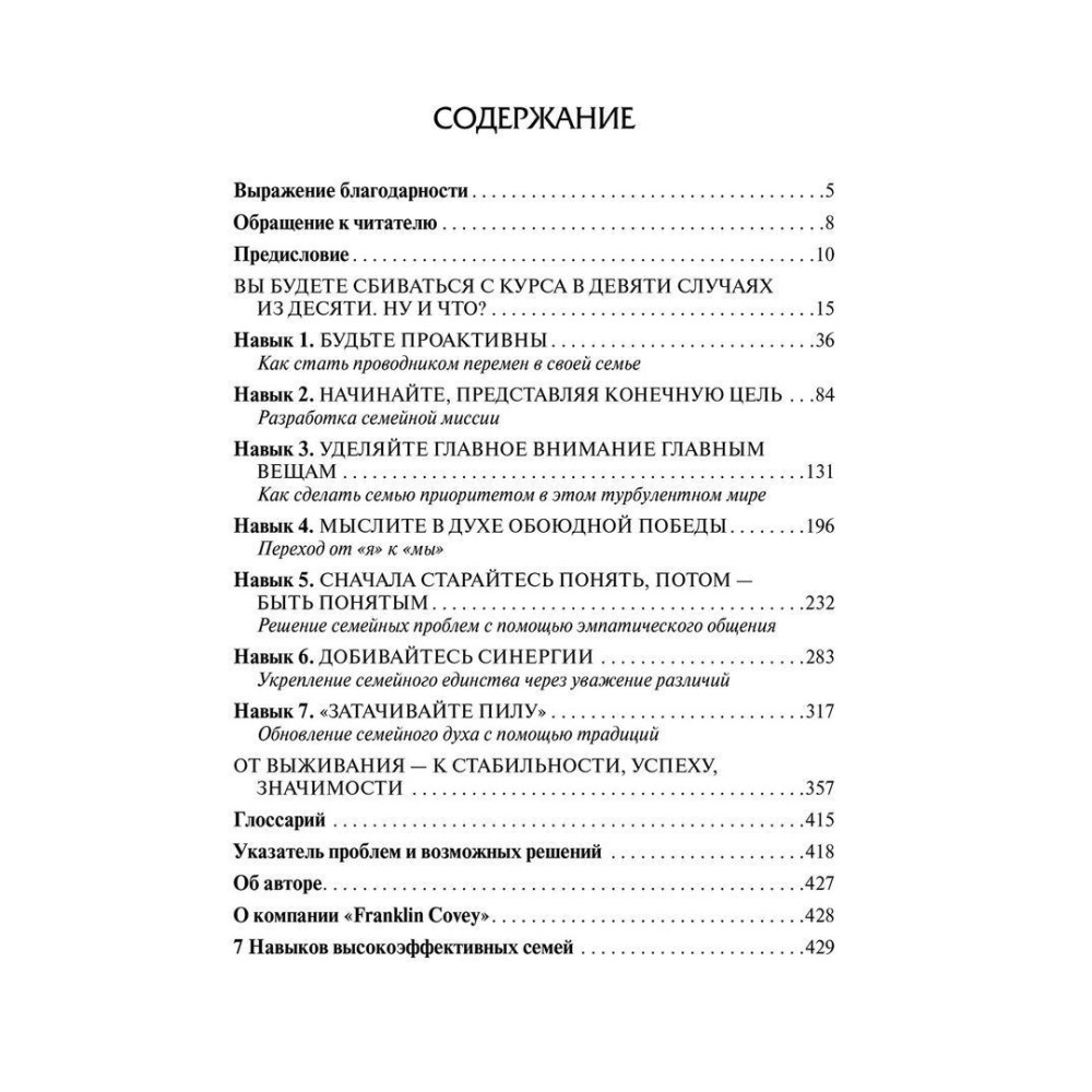 З притаманною йому нехитрістю і життєвою мудрістю, що вже завоювала серця мільйонів читачів, Стівен Р. Кові у книзі «7 Навыков высокоэффективных семей. Как создать по-настоящему крепкую семью в наше неспокойное время» розповідає, як використовувати його популярну концепцію семи навичок для встановлення найтепліших і найближчих стосунків у сім'ї, дає поради щодо розв'язання багатьох проблем, які рано чи пізно постають перед кожним із нас.