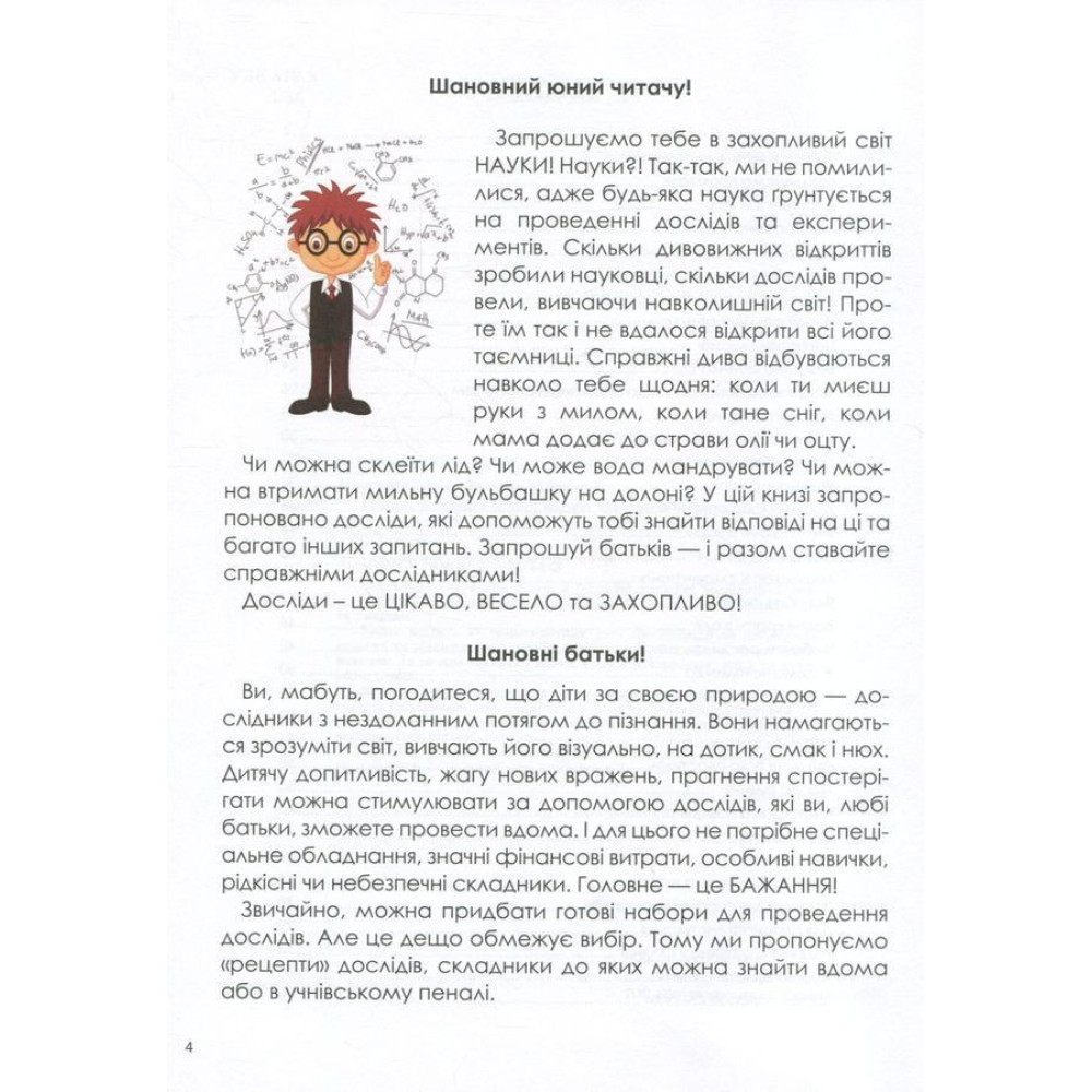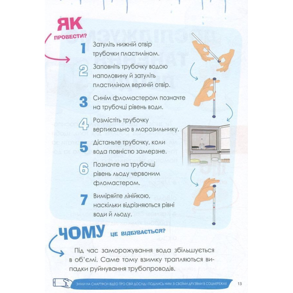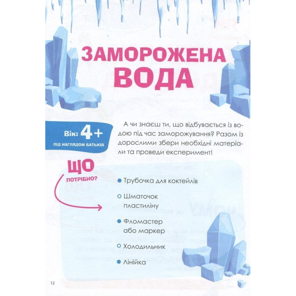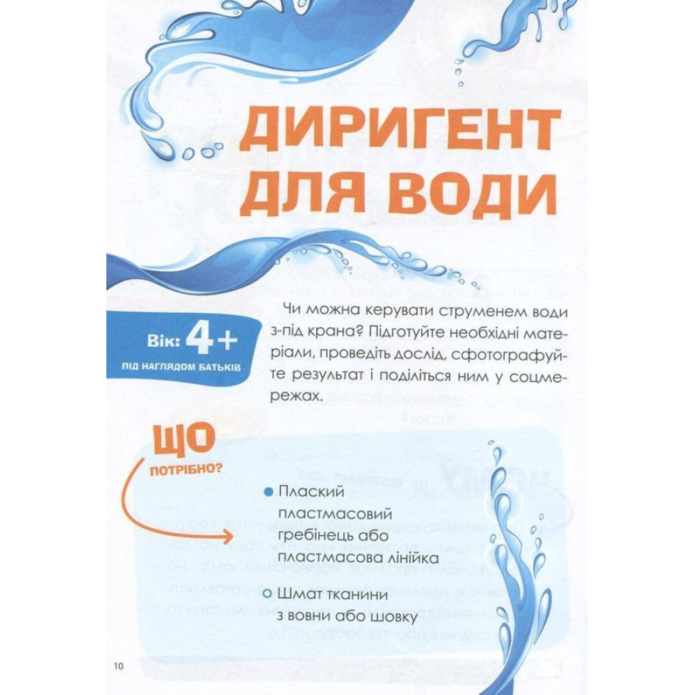 Чи можна склеїти лід? Чи може вода мандрувати? Чи можна утримати мильну бульбашку на долоні? Це можна перевірити, адже книга містить 37 різноманітних, цікавих та безпечних дослідів, за допомогою яких можна стимулювати дитячу допитливість та жагу нових вражень. Вони не потребують дорогих чи рідкісних складників, спеціального обладнання або особливих навичок — їх можна провести вдома з тими речовинами, які є на кухні або в шкільному портфелі.