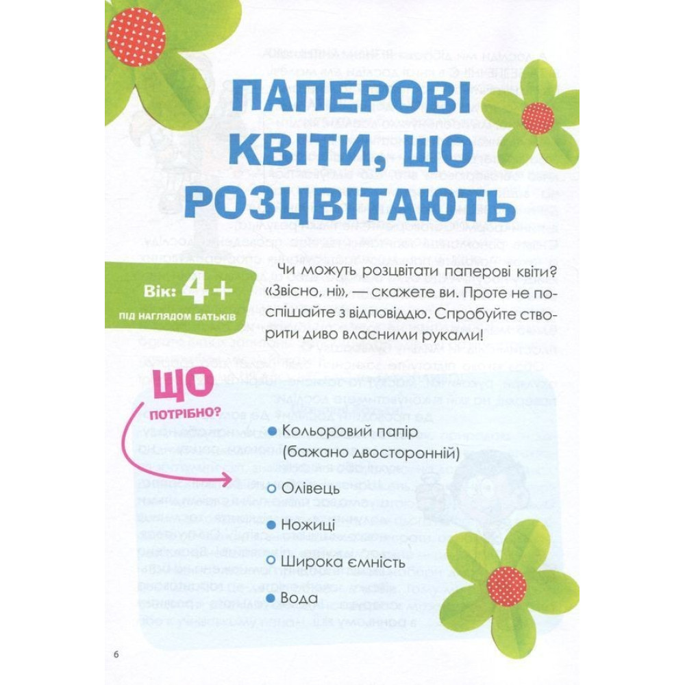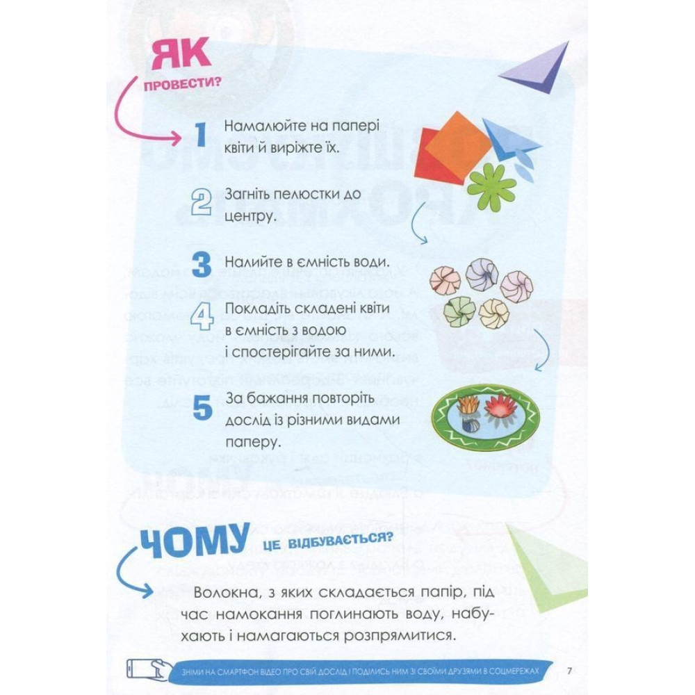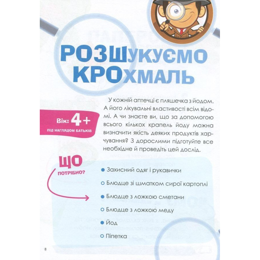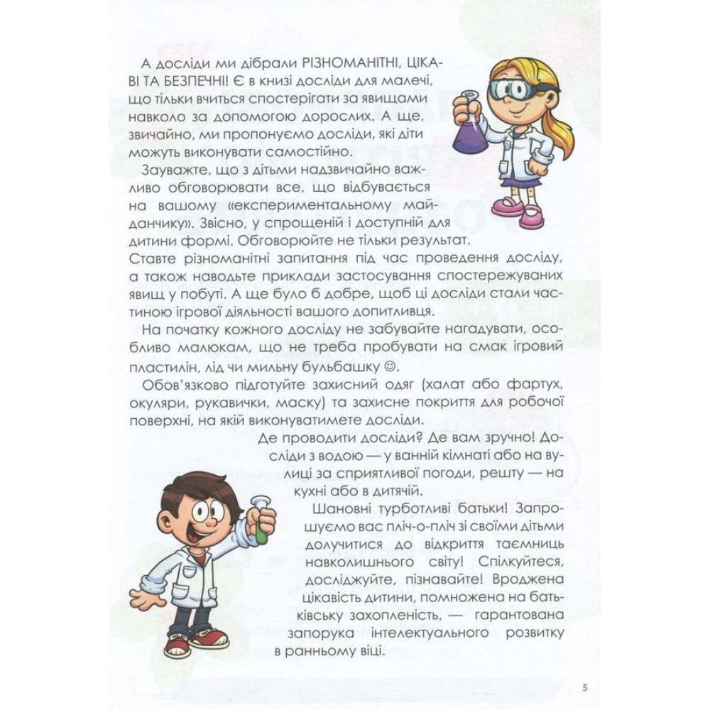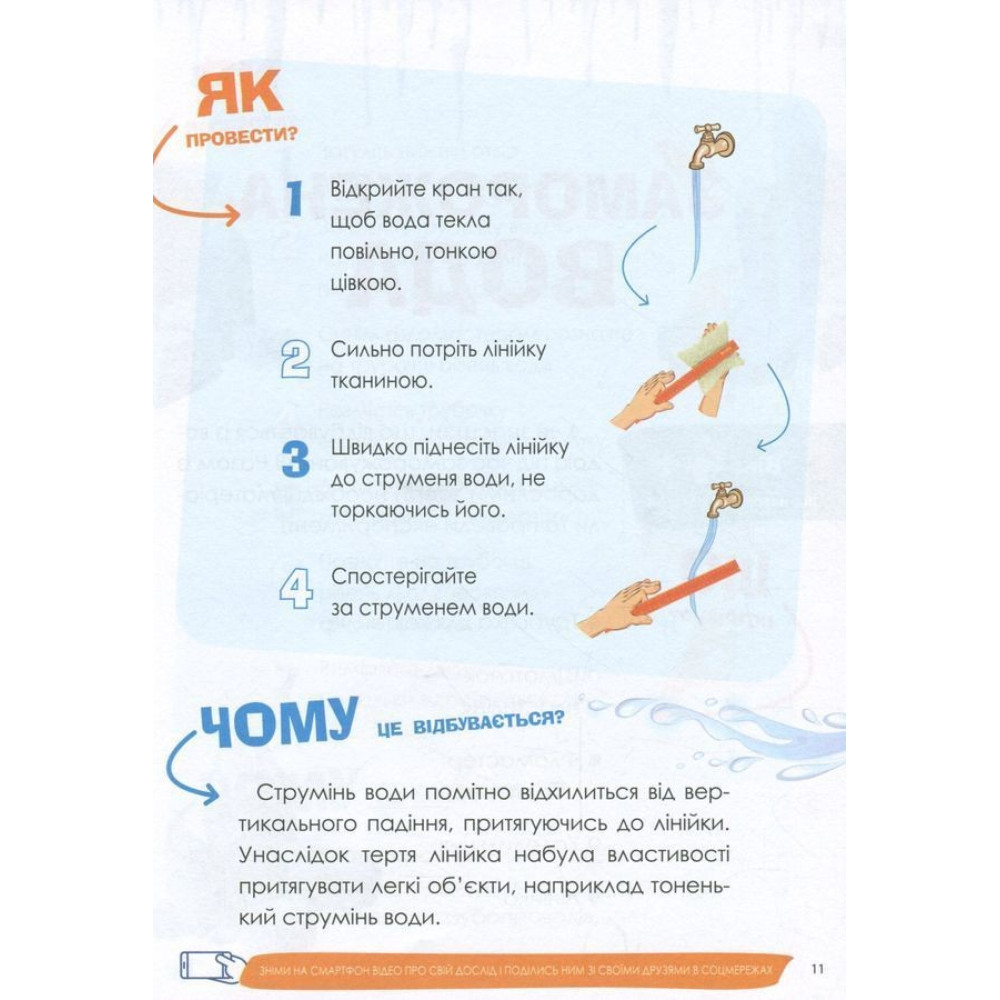 Чи можна склеїти лід? Чи може вода мандрувати? Чи можна утримати мильну бульбашку на долоні? Це можна перевірити, адже книга містить 37 різноманітних, цікавих та безпечних дослідів, за допомогою яких можна стимулювати дитячу допитливість та жагу нових вражень. Вони не потребують дорогих чи рідкісних складників, спеціального обладнання або особливих навичок — їх можна провести вдома з тими речовинами, які є на кухні або в шкільному портфелі.