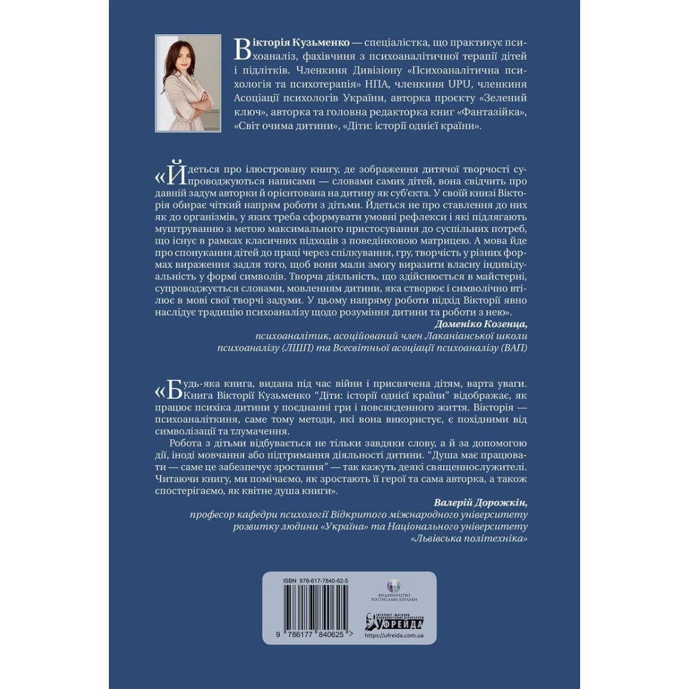 Вікторія Кузьменко — спеціалістка, що практикує психоаналіз, фахівчиня з психоаналітичної терапії дітей і підлітків; членкиня Дивізіону «Психоаналітична психологія та психотерапія» НПА, членкиня UPU, членкиня Асоціації психологів України; авторка проєкту «Зелений ключ», авторка та головна редакторка книг «Фантазійка», «Світ очима дитини», «Діти: історії однієї країни».