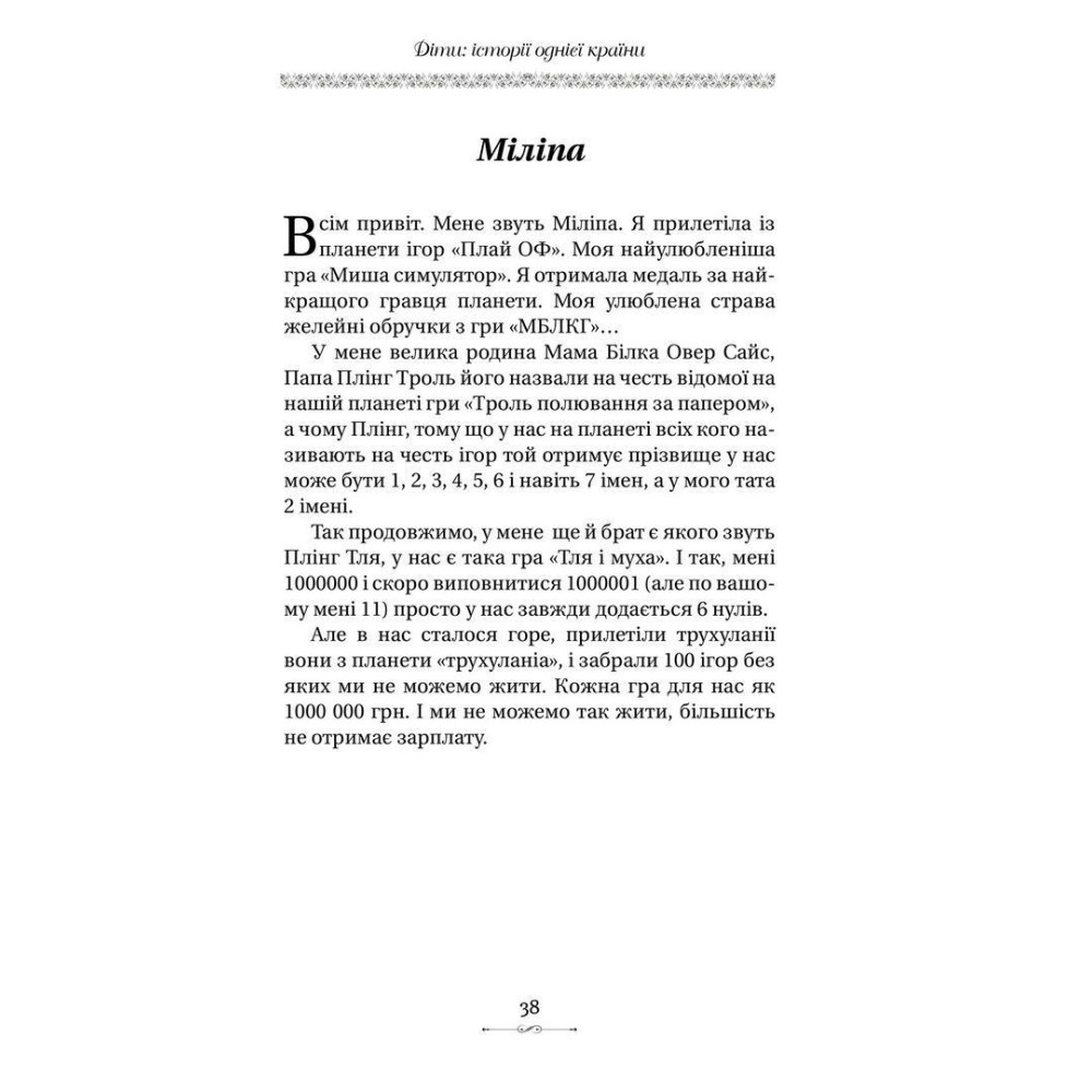 Книга «Діти: історії однієї країни» за авторством Вікторії Кузьменко містить збірку історій, написаних групою дітей з дев'яти чоловік. Ідея книги полягає в поєднанні гри й повсякденного життя дитини в єдиний психологічний продукт-історію. Кожна історія — це місце культурного досвіду юного суб’єкта, яке відкривається й наповнюється під час нормального психологічного розвитку, взаємодії дитини з матір’ю у грі та творчості.
