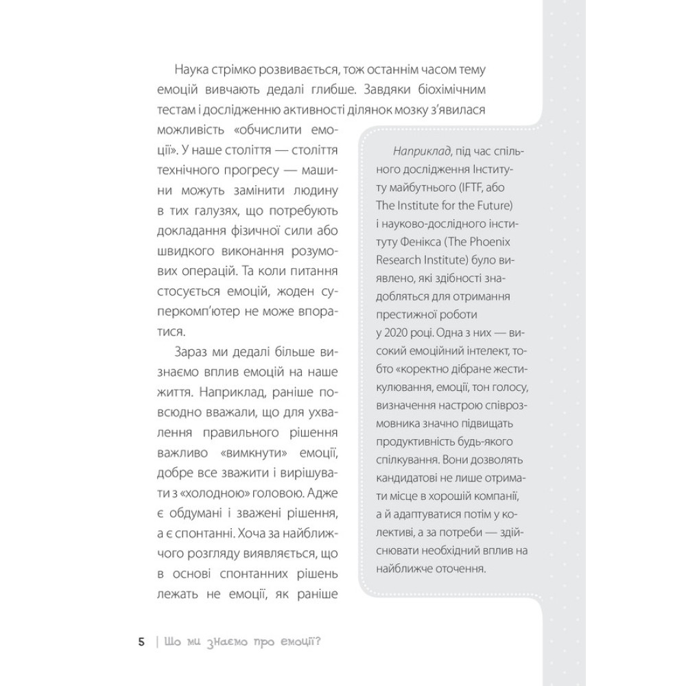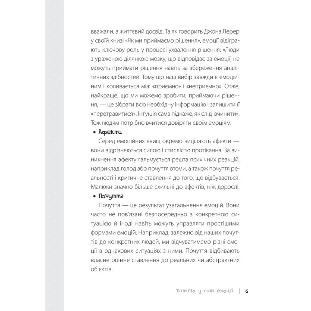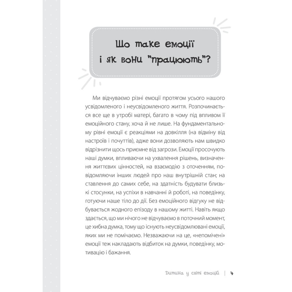 Ми відчуваємо різні емоції протягом усього нашого усвідомленого і неусвідомленого життя. Автор книги «Дитина у світі емоцій» — Марія Сергіївна Малихіна, психологиня-практик, яка понад 10 років працює з молодими батьками. Марія зазначає, що найбільше запитань постає саме з приводу емоційного інтелекту.