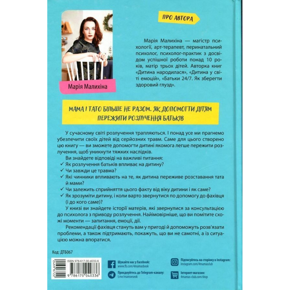 Марія Малихіна — психологиня з багаторічним досвідом. Вона вклала у свою книгу не лише досвід фахівця, але й досвід мами двох дітей, яка пройшла розлучення з адаптацією дітей до нового життя, а надалі до життя в новій сім’ї.