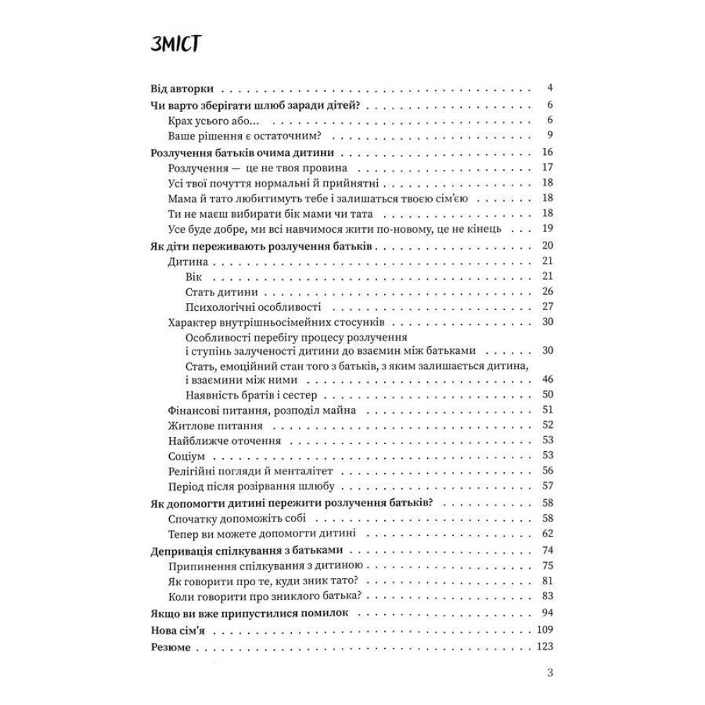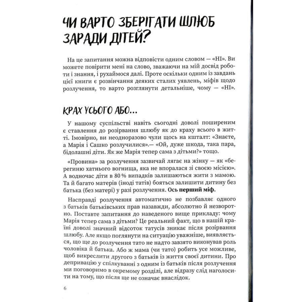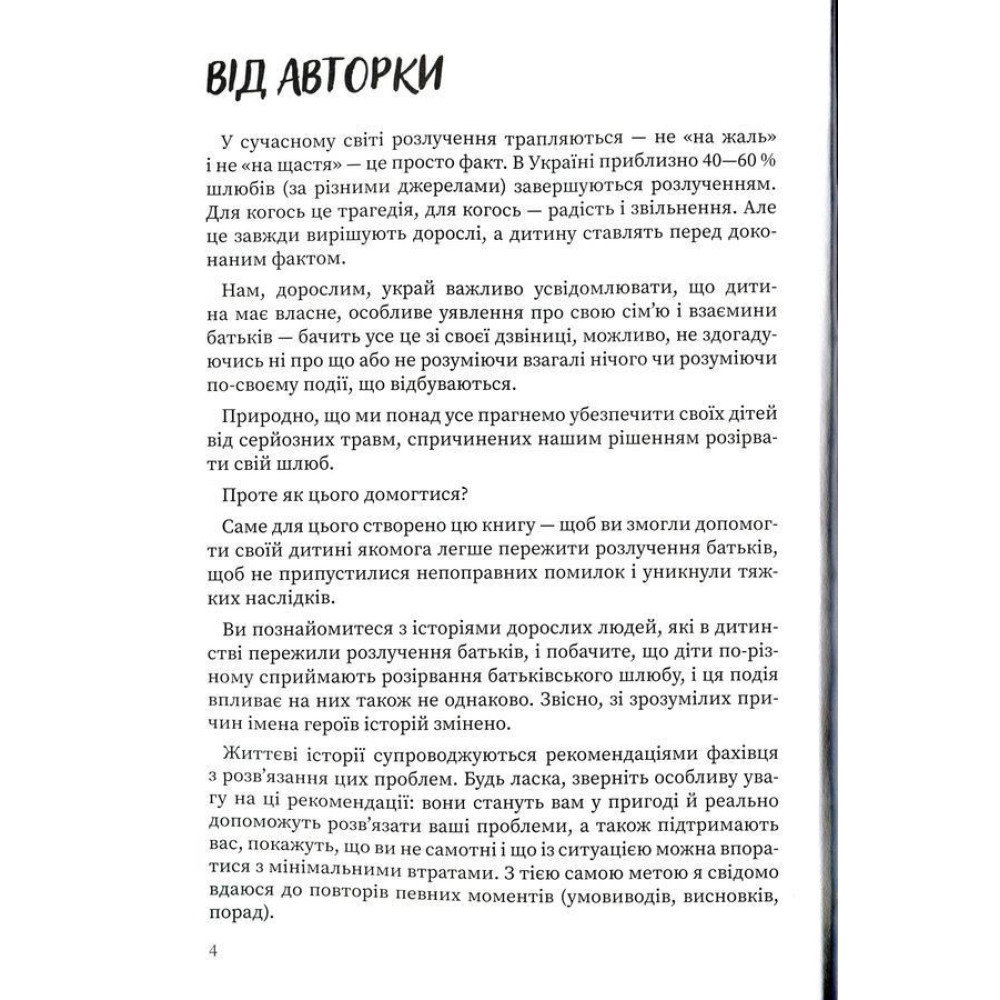 Також у книзі авторка розповідає про інші ситуації та аспекти розлучення, як наприклад: