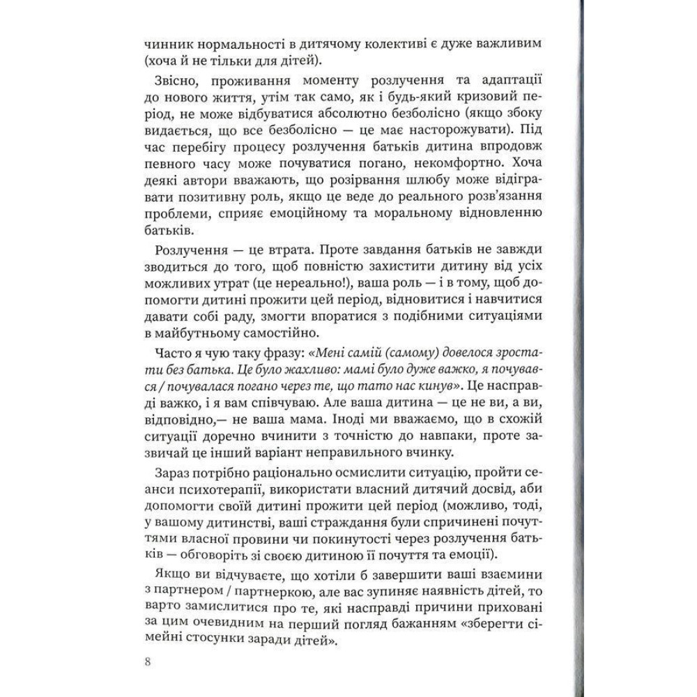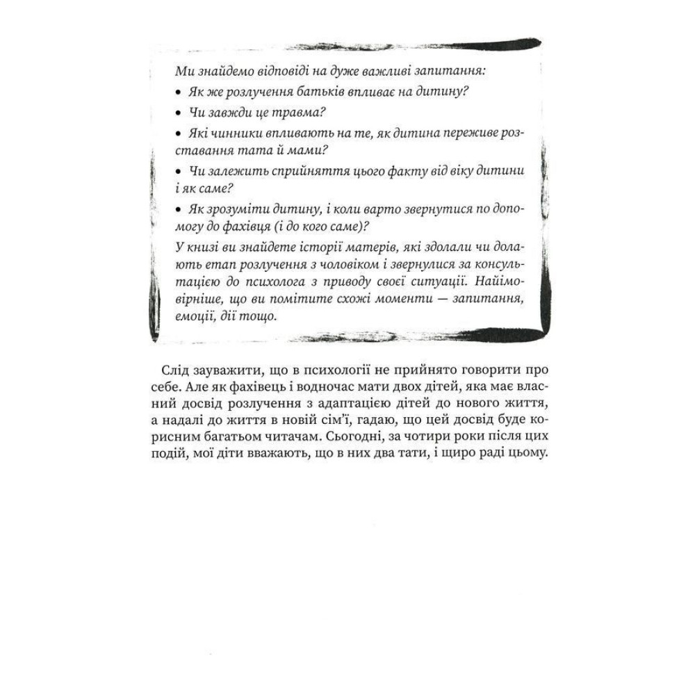 У книзі Марії Малихіної «Мама і тато більше не разом. Як допомогти дітям пережити розлучення батьків» ви знайдете історії матерів, які звернулися за консультацією до психолога з приводу розлучення. Найімовірніше, що ви помітите схожі моменти — запитання, емоції, дії. Рекомендації фахівця стануть вам у пригоді й допоможуть розв’язати проблеми, а також підтримають. Ви також дізнаєтеся про історії вже дорослих людей, які в дитинстві пережили розлучення батьків, і побачите, що діти по-різному сприймають розірвання батьківського шлюбу, і ця подія впливає на них також неоднаково.