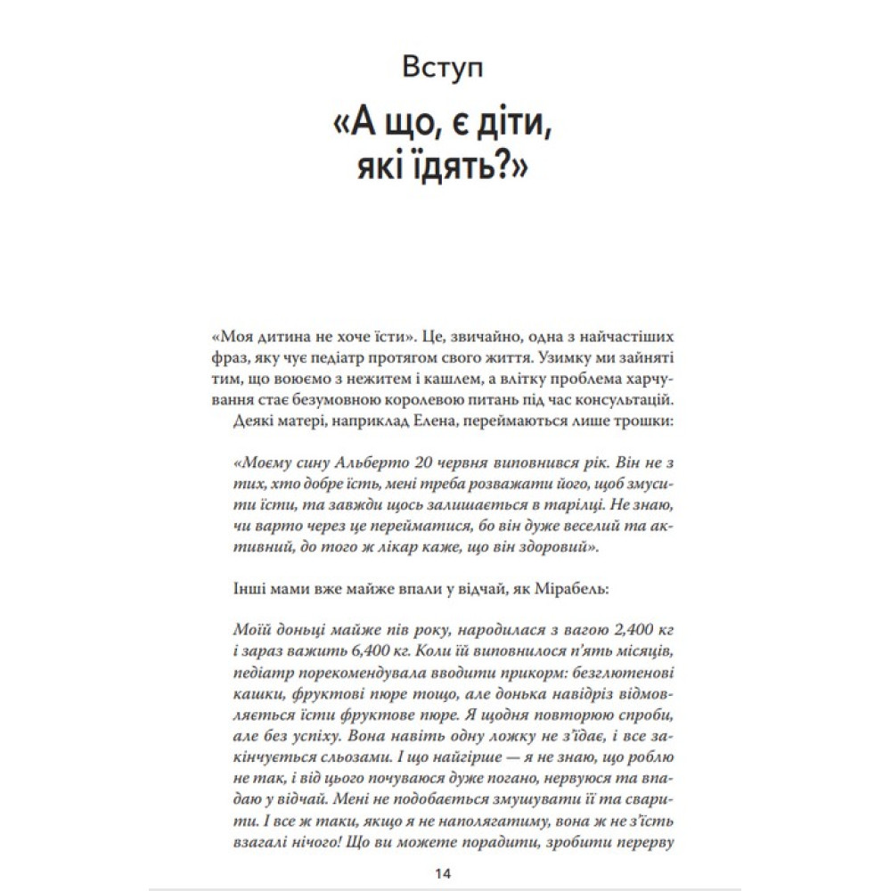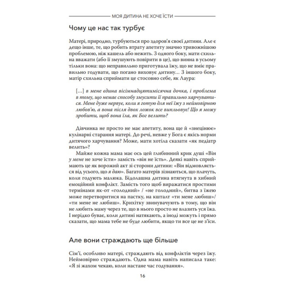 Прочитавши книгу "Моя дитина не хоче їсти" ви перестанете турбуватись через дитячі відмови їсти і будете краще розуміти таку поведінку дитини, а відтак — вам буде легше знайти найкраще рішення проблеми, що задовольнить і вас, і ваших малюків.