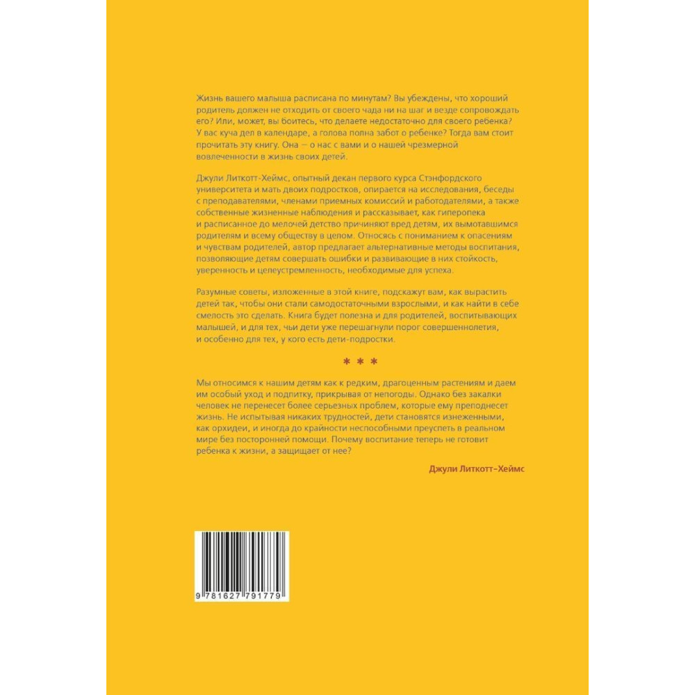 Ставлячись із розумінням до тих страхів і почуттів батьків, які призводять до гіперопіки, Джулі пропонує альтернативні методи виховання, які дають змогу дітям помилятися, розвиваючи в них стійкість, упевненість, винахідливість і цілеспрямованість, необхідні для успіху.