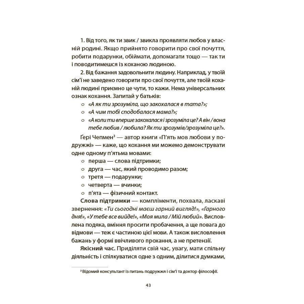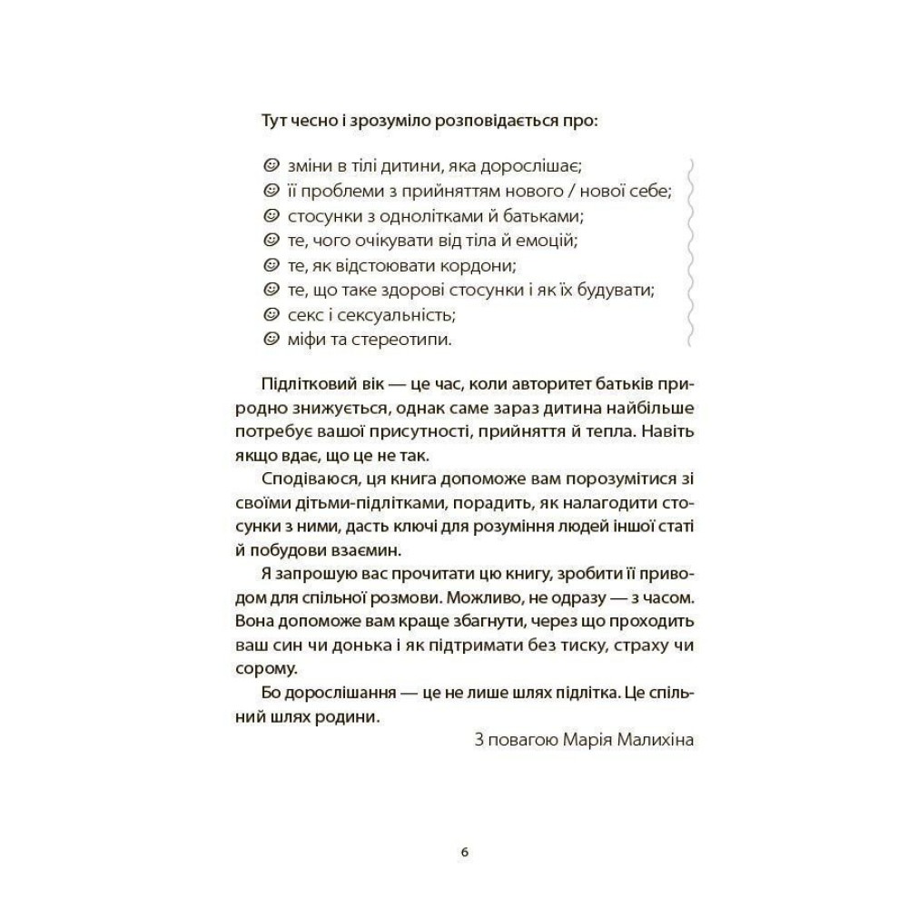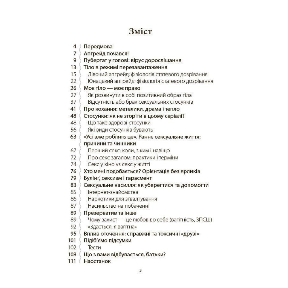 Авторка допомагає говорити про складне просто: про зміни в тілі, сексуальний розвиток, емоції, закоханість, кордони, стосунки й самоцінність. Книга руйнує поширені міфи, пояснює, як відрізняти правду від фейків, і підтримує підлітка в період, коли життя проходить важливий «апгрейд».