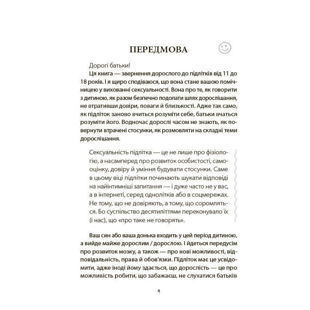 «Поговори зі мною! Як розмовляти з підлітком про тіло, почуття та стосунки» — це чесна, сучасна й дуже потрібна книга про діалог між дорослими та підлітками у віці від 11 до 18 років. Вона створена як звернення без повчань, сорому й заборон — з повагою до особистості підлітка та його досвіду.