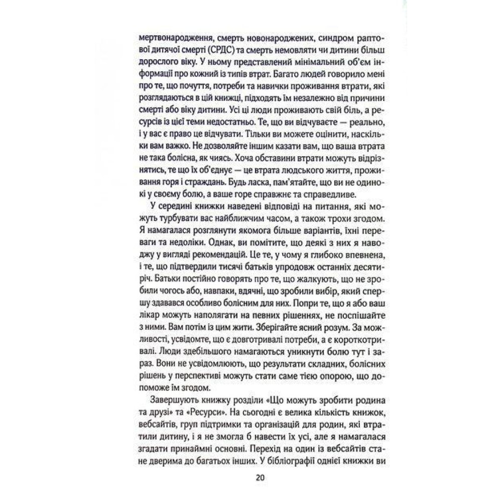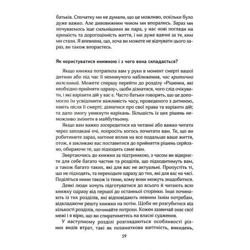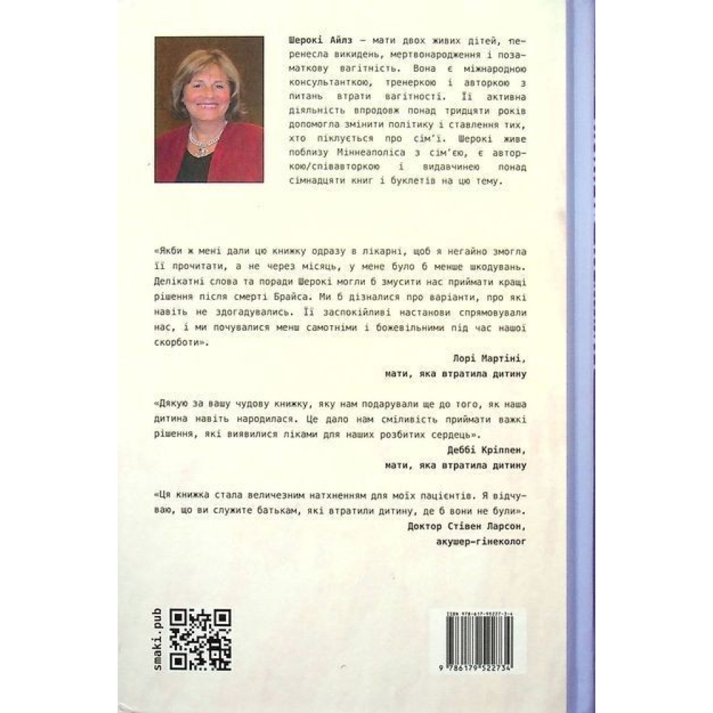 Унікальний і обнадійливий, він стосується всіх, кого торкнулася дитяча смерть або викидень. Зі співчуттям і чуйністю авторка, яка сама пройшла кілька разів через цей болючий досвід, пропонує практичні поради та підтримку для прийняття рішень у момент втрати і допомагає пережити наступні місяці та роки.