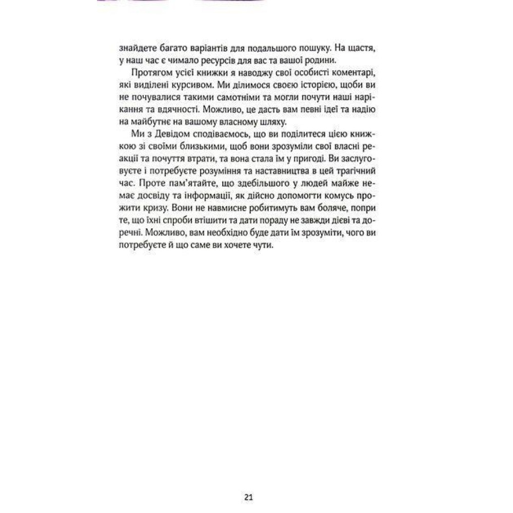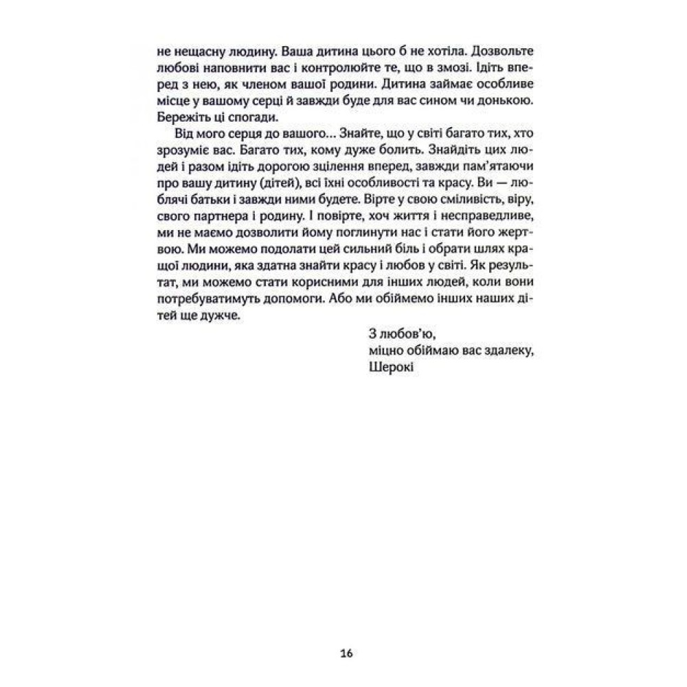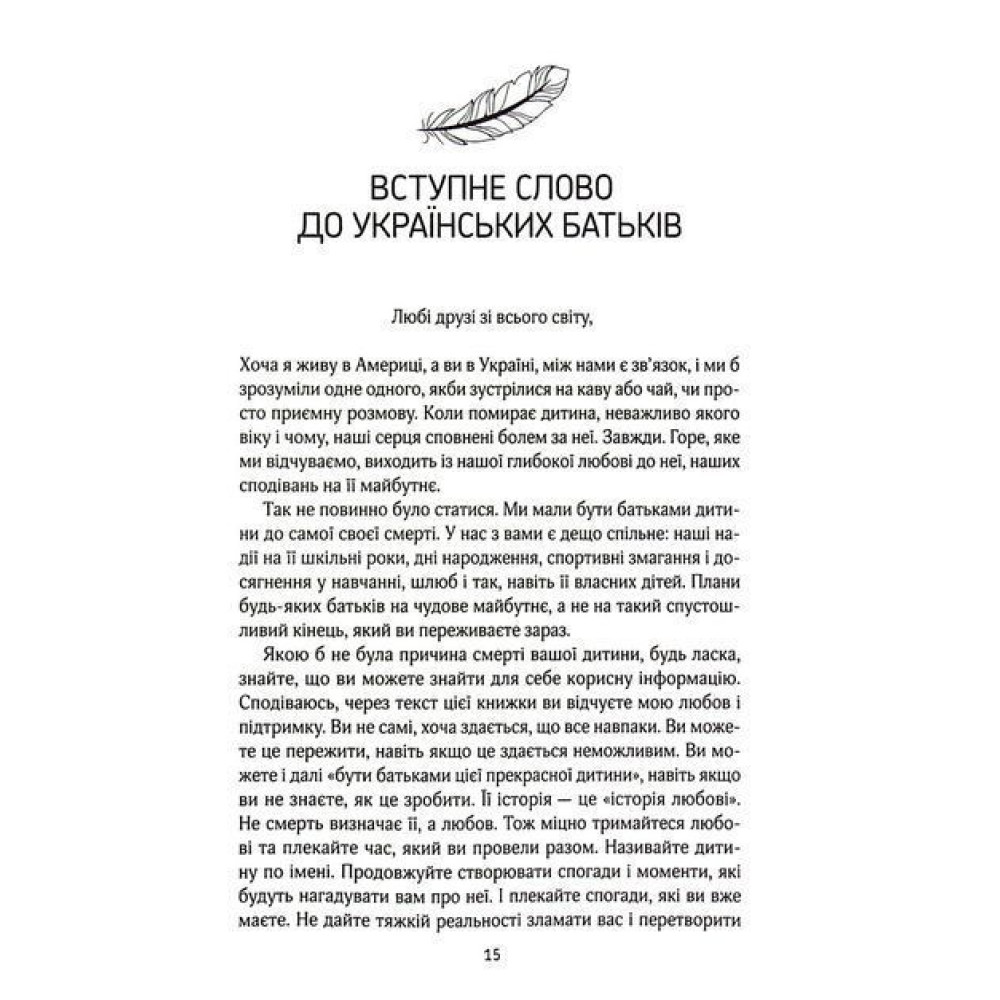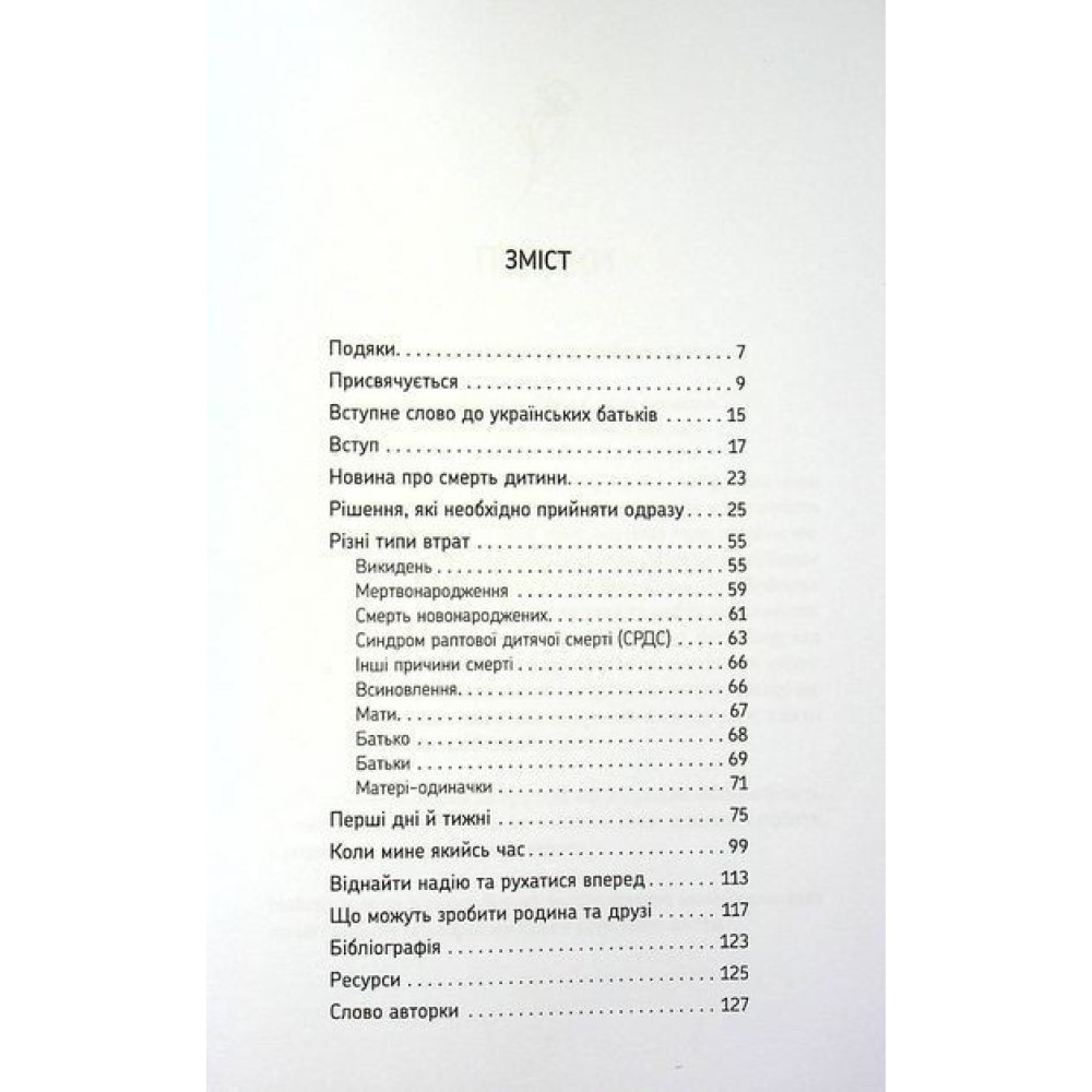 Унікальний і обнадійливий, він стосується всіх, кого торкнулася дитяча смерть або викидень. Зі співчуттям і чуйністю авторка, яка сама пройшла кілька разів через цей болючий досвід, пропонує практичні поради та підтримку для прийняття рішень у момент втрати і допомагає пережити наступні місяці та роки.