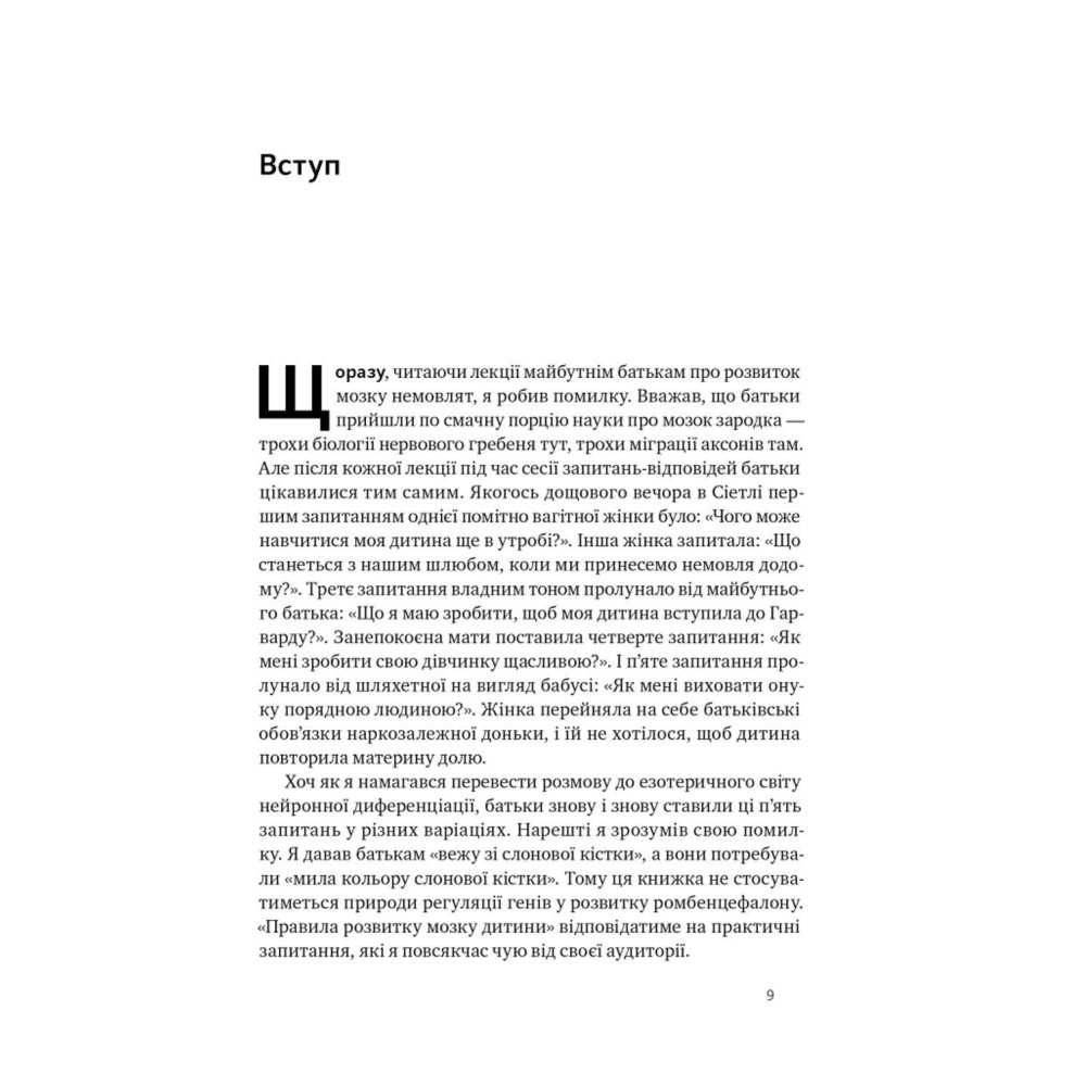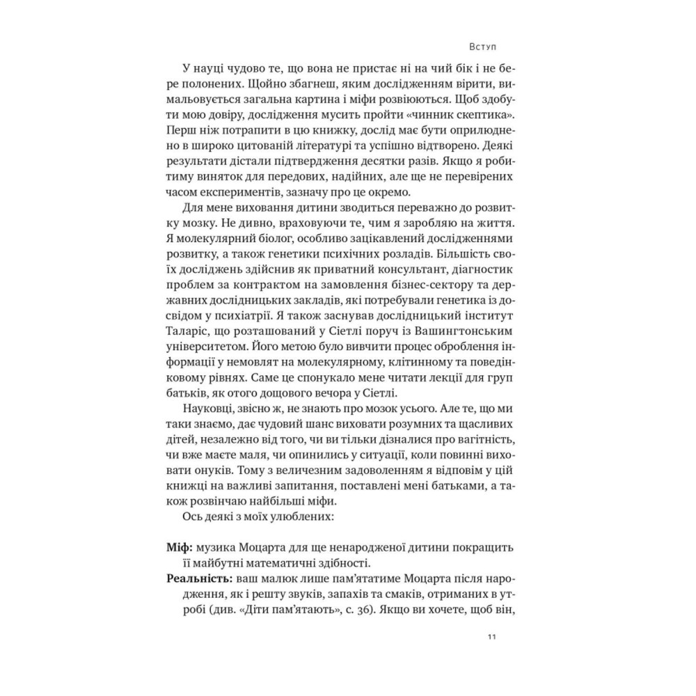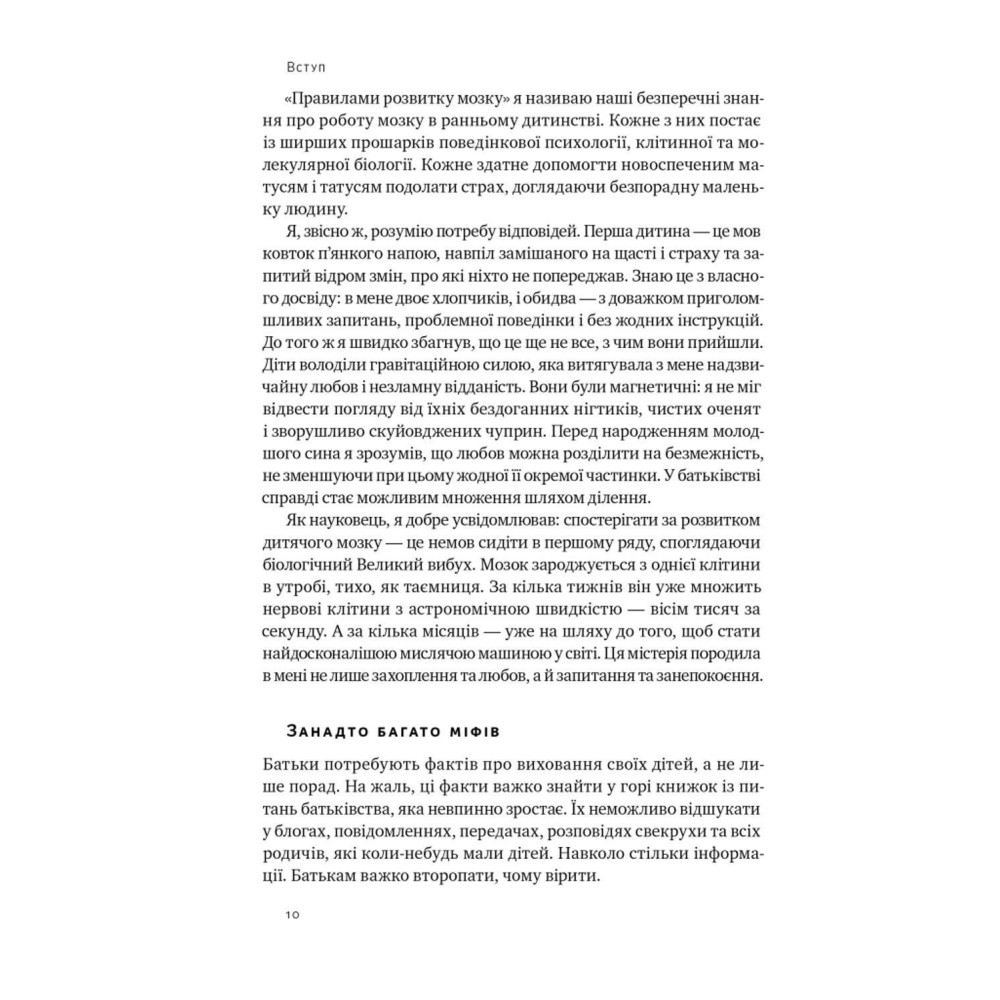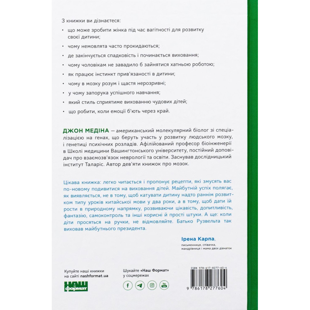 Молекулярний біолог та батько двох дітей Джон Медіна у своїй книзі «Правила розвитку мозку дитини. Ростимо розумного і щасливого малюка від 0 до 5 років» руйнує міфи про розвиток мозку дитини і відкриває очі на справжню суть популярних методів, препаратів та іграшок, які начебто зроблять вашу дитину генієм.