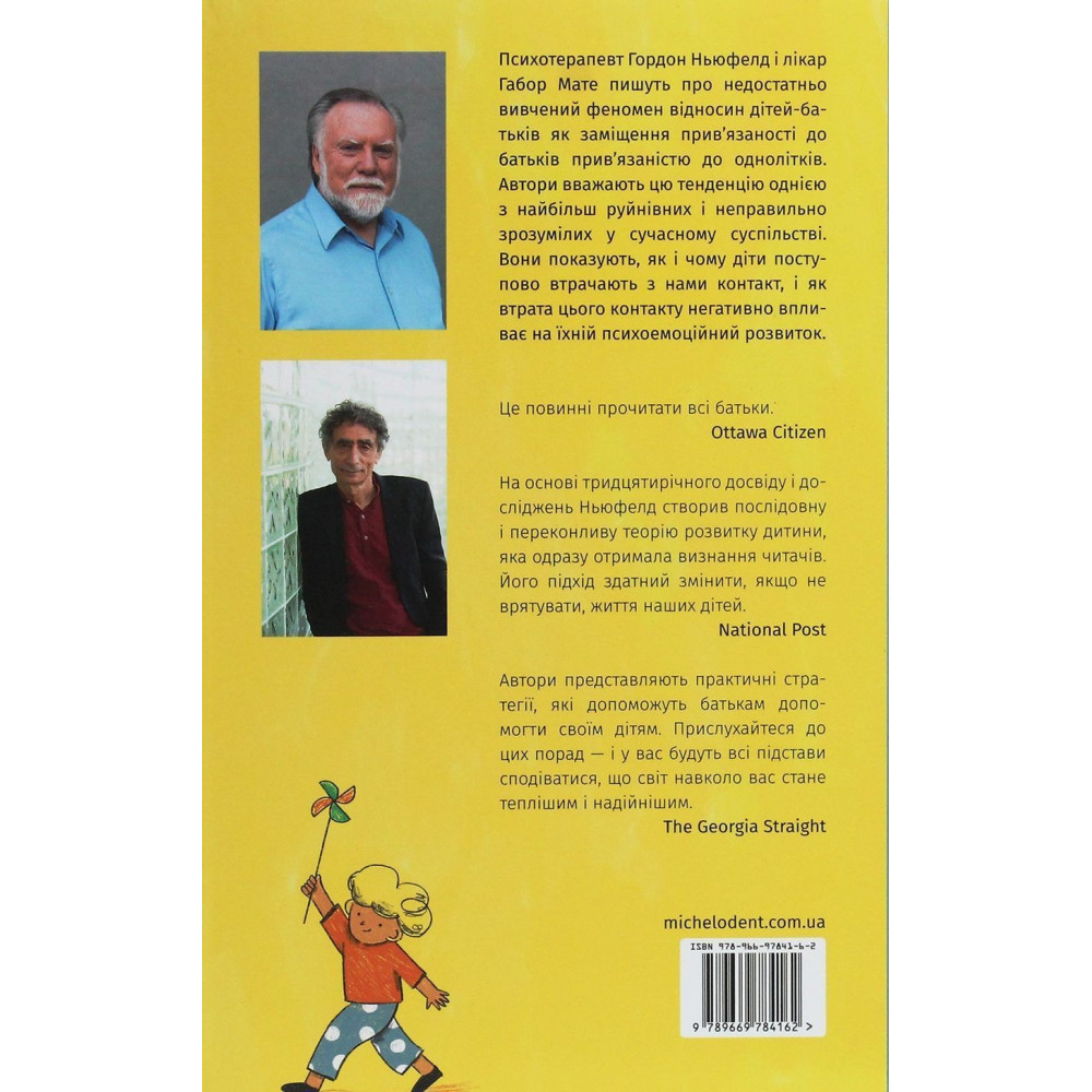 Книга «Тримайтеся за своїх дітей. Чому батьки мають бути важливішими за однолітків», написана докторами Гордоном Ньюфелдом і Габором Мате, розповідає про ключову роль стосунків між дітьми та тими, хто несе за них відповідальність, а також про руйнівний вплив конкуруючих прив’язаностей із однолітками в сучасному суспільстві. Однак це набагато більше, ніж книга про орієнтацію на однолітків: йдеться про батьківство з урахуванням стосунків. Ця книга повертає батькам їхню природну інтуїцію, протистоїть таким руйнівним методам як тайм-аути і використання значимих для дитини речей проти неї. Адже керуючись цими порадами, багато батьків вже зрозуміли, що вони дуже добре працюють в короткій перспективі, але завдають величезної шкоди стосункам.