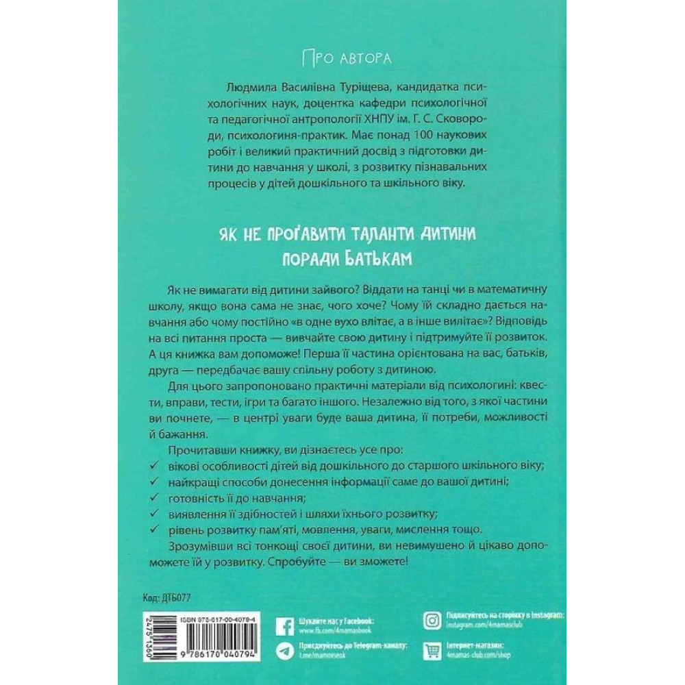 Як не вимагати від дитини зайвого? Віддати на танці чи в математичну школу, якщо вона сама не знає, чого хоче? Чому їй складно дається навчання або чому постійно «в одне вухо влітає, а в друге вилітає»? Відповідь на всі питання проста — вивчайте свою дитину і підтримуйте її розвиток. А книга «Як не проґавити таланти дитини? Поради батькам» за авторством Людмили В. Туріщевої буде в поміч.