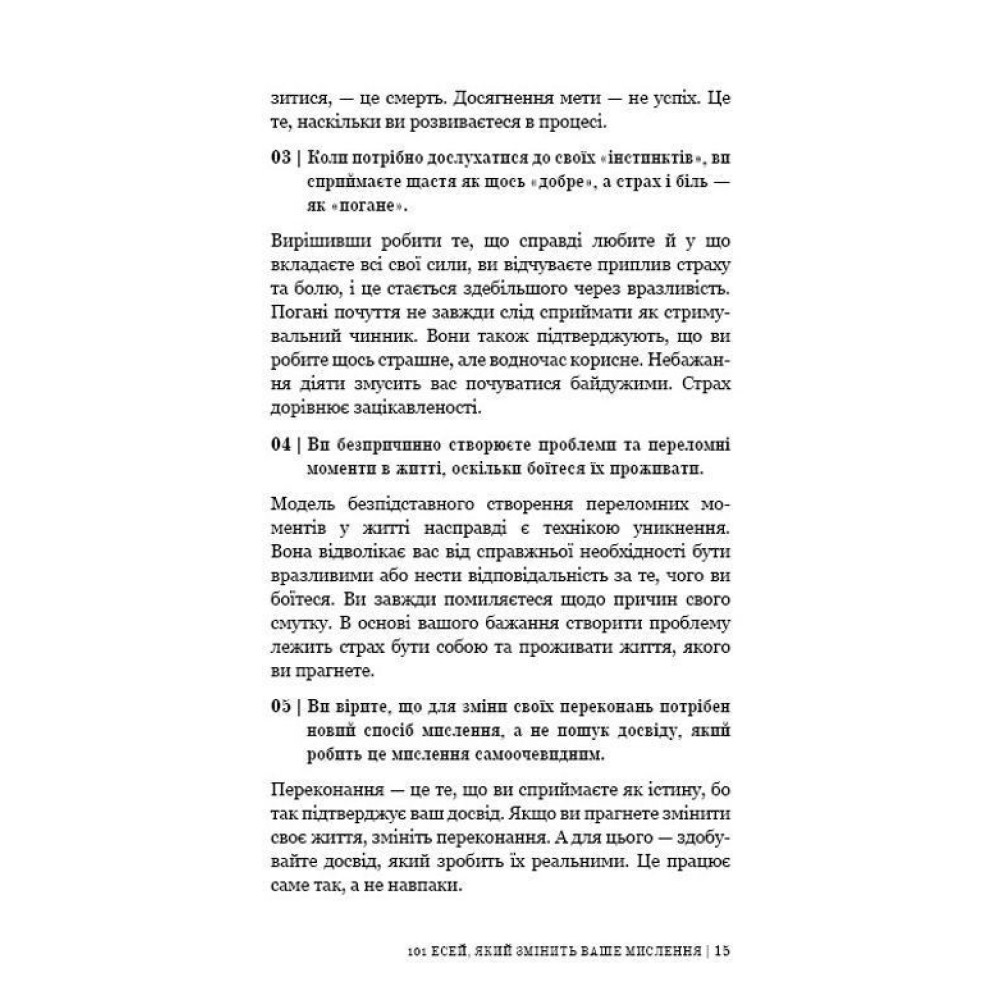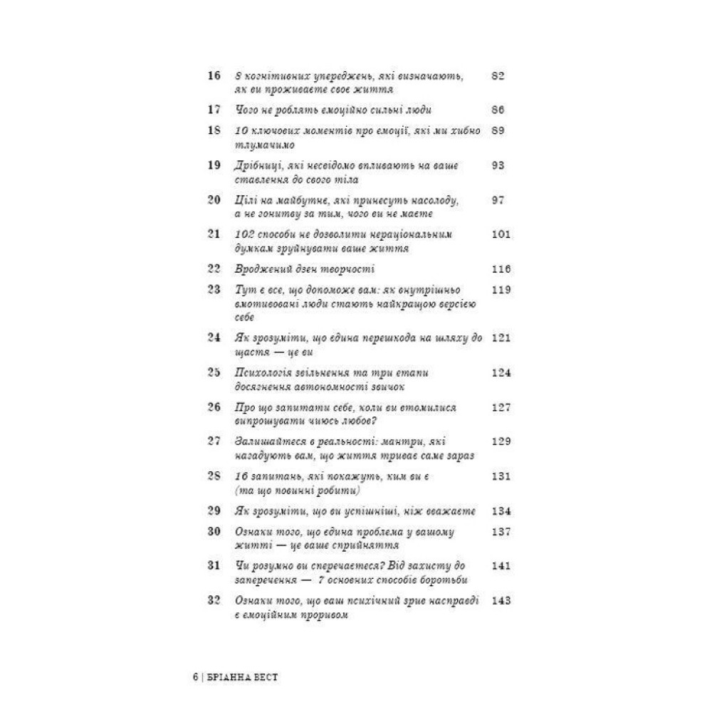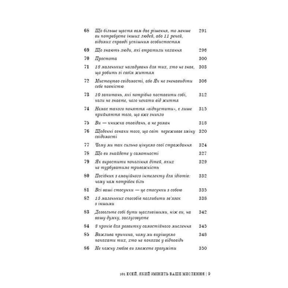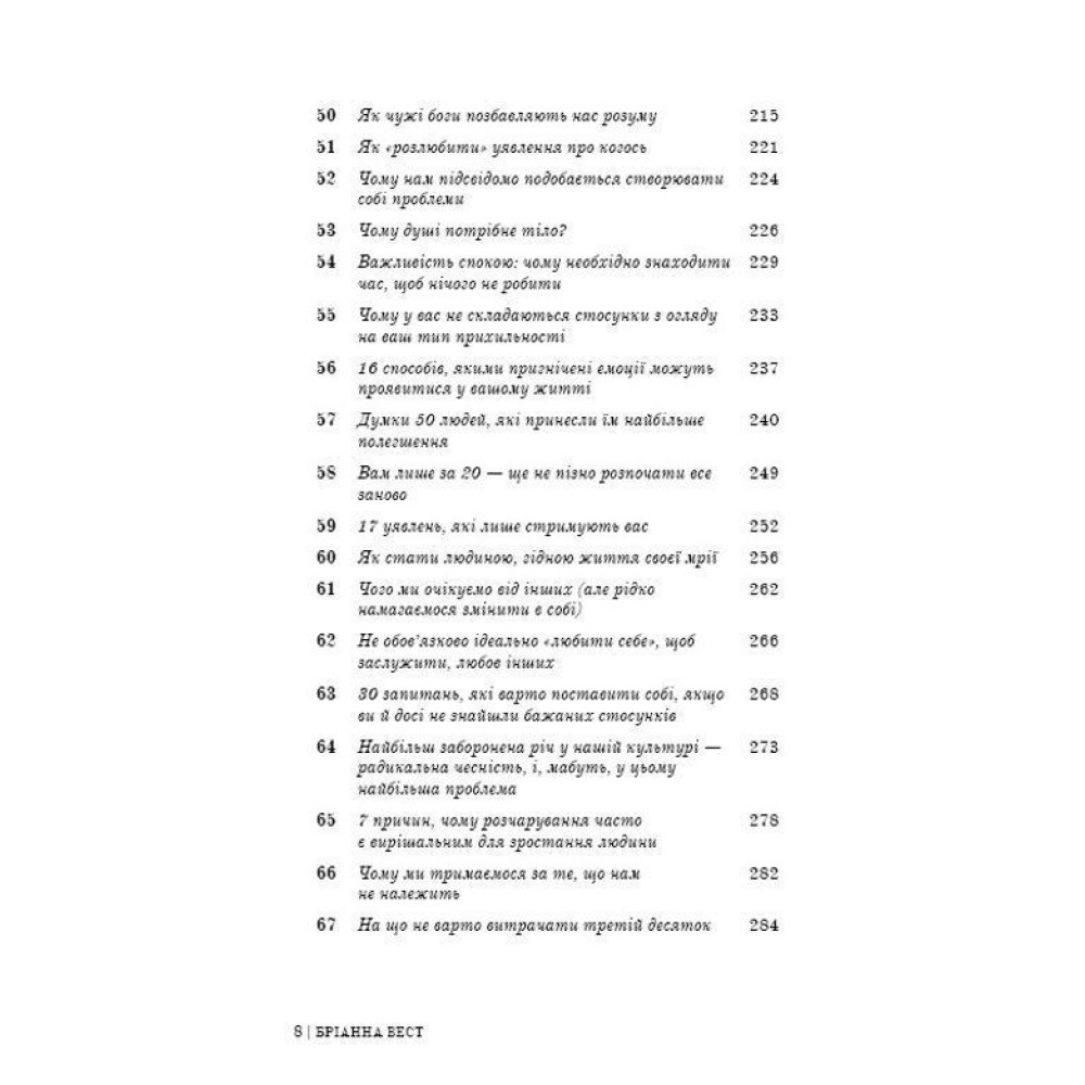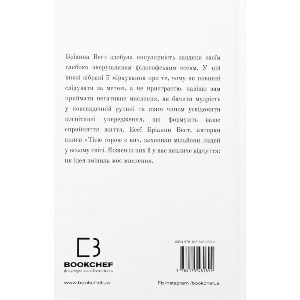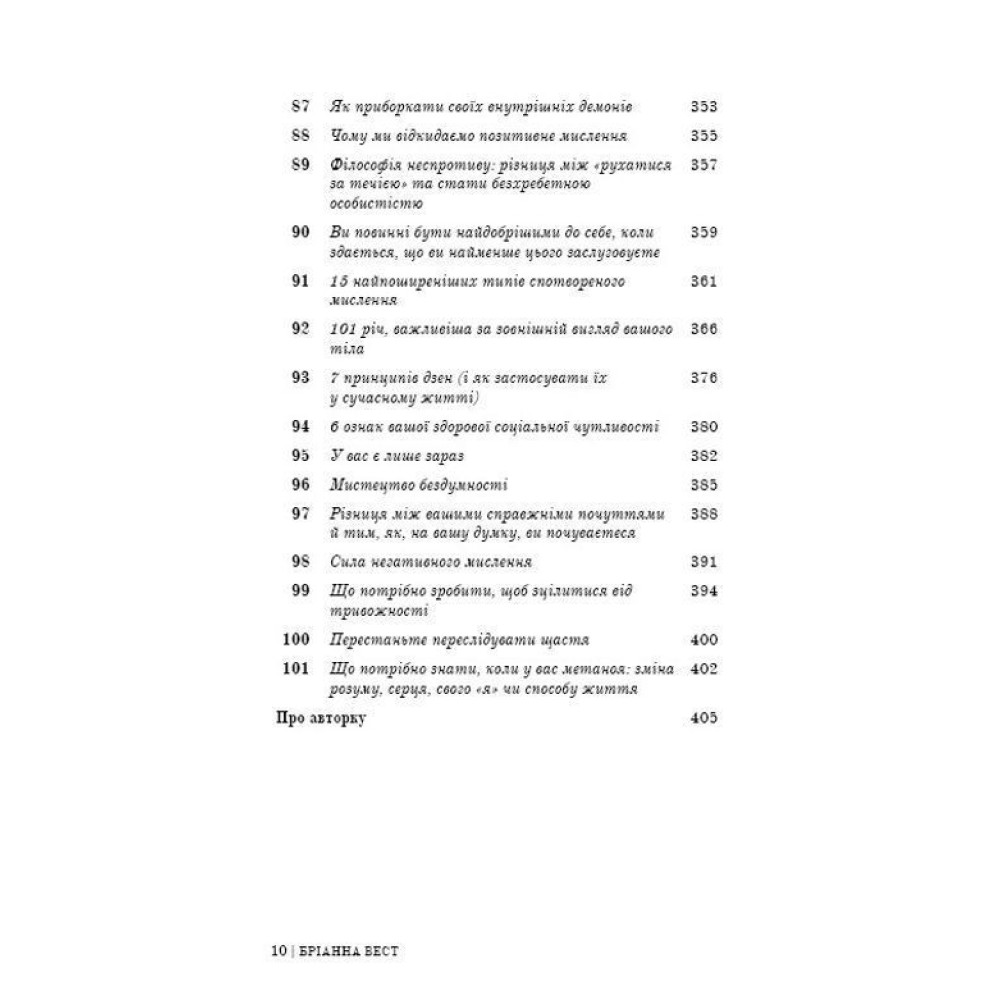 Цей бестселер за авторством Бріанни Вест — «101 есей, який змінить ваше мислення» — здатний замінити десятки книг із психології та саморозвитку, бо якщо й було прочитано багато такої літератури, все одно лишаються запитання, які хвилюють і заважають жити. Бріанна Вест, авторка ще одного бестселера — «Тією горою є ви», не навчатиме вас новим стратегіям подолання проблем. Вона доступно, коротко й влучно описує те, чого нам не вистачає для щастя, інтуїтивно вгадуючи (а може, й знаючи точно), що саме змусить нас по-іншому глянути на власні проблеми й знайти шлях до їх вирішення. Вона просто говорить і розмірковує, ділиться особистим, а вдумливий читач отримує інсайти, які, своєю чергою, підштовхують до важливих змін.