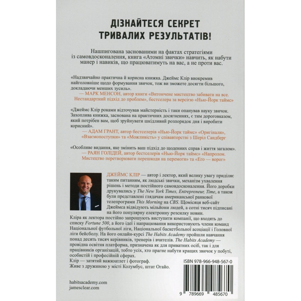 Джеймс Клір — автор і лектор, який велику увагу приділяє таким питанням, як людські звички, механізм ухвалення рішень і методи постійного самовдосконалення. Його доробки друкувались у The New York Times, Entrepreneur, Time, а також були представлені глядачі американської ранкової телепрограми This Morning на CBS. Щомісяця веб-сайт Джеймса відвідують мільйони людей, а сотні тисяч підписані на його популярну електронну розсилку новин. Кліра як лектора постійно запрошують виступити компанії, що входять до списку Fortune 500, а його ідеї і напрацювання використовують члени команд Національної футбольної ліги, Національної баскетбольної асоціації і Головної ліги бейсболу. На його онлайн-курсі The Habits Academy пройшли навчання понад десять тисяч керівників, тренерів і вчителів. The Habits Academy — провідна освітня платформа, призначена як для приватних осіб, так і для працівників організацій, тобто усіх, хто прагне набути кращих звичок у побуті, особистій і професійній сферах.