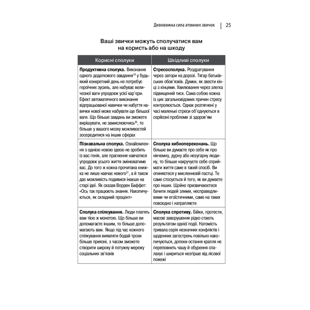 Викладений матеріал підтверджується результатами наукових досліджень, проте книгу слід трактувати не як наукову розвідку, а як посібник з експлуатації, що містить мудрі практичні поради та пояснення механізмів створення і змінювання власних звичок. Єдиного правильного способу набуття корисних звичок, звісно, не існує, але автор пропонує найкращий із відомих підхід, який спрацює незалежно від того, з чого саме ви починаєте і що саме намагаєтеся змінити.