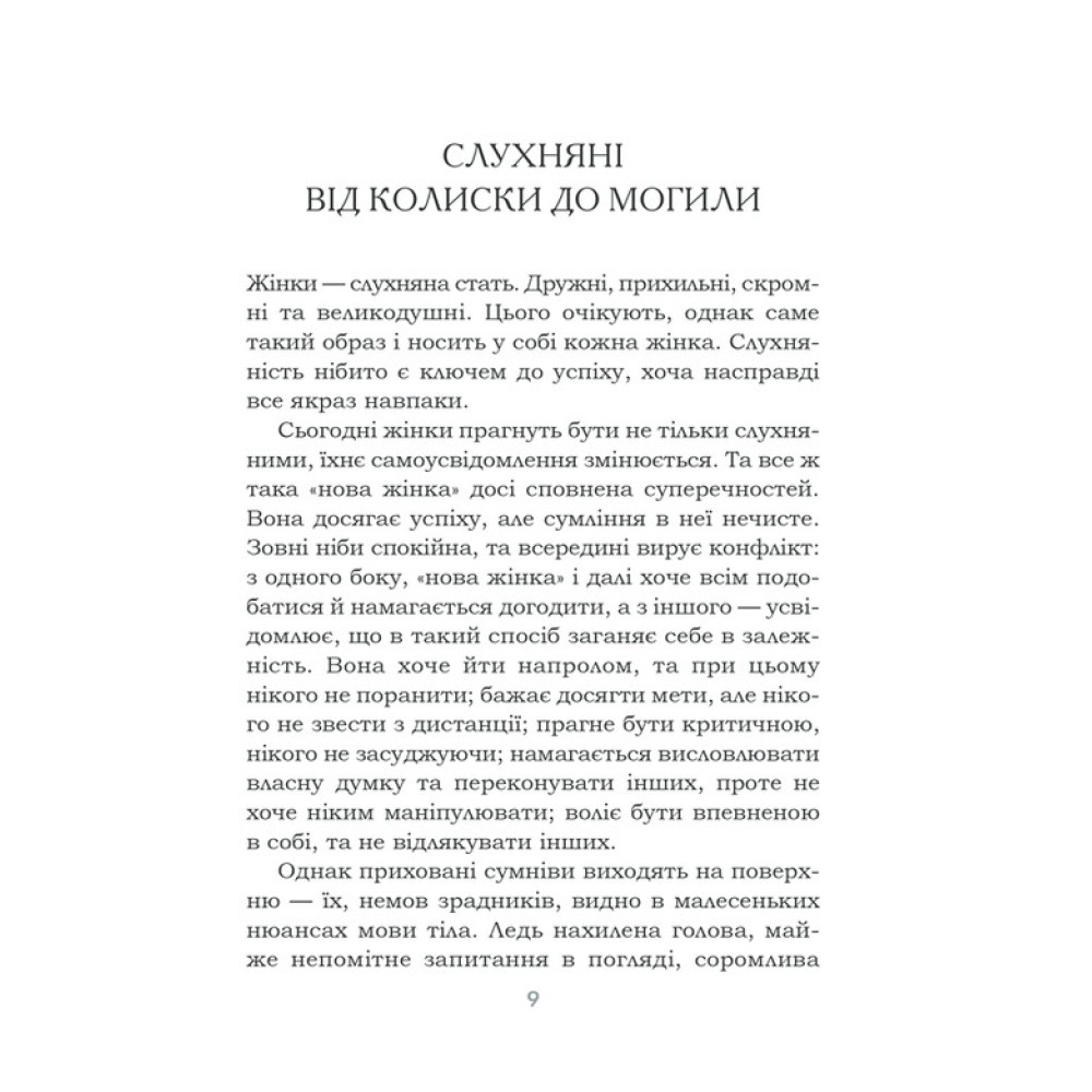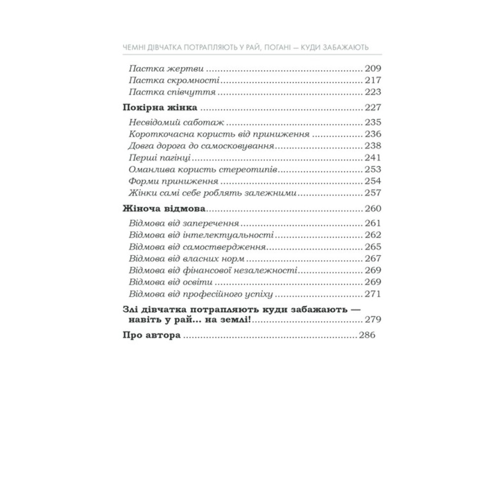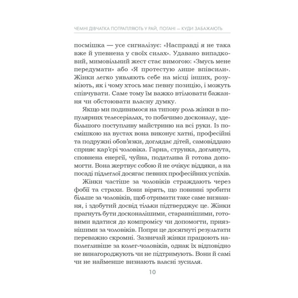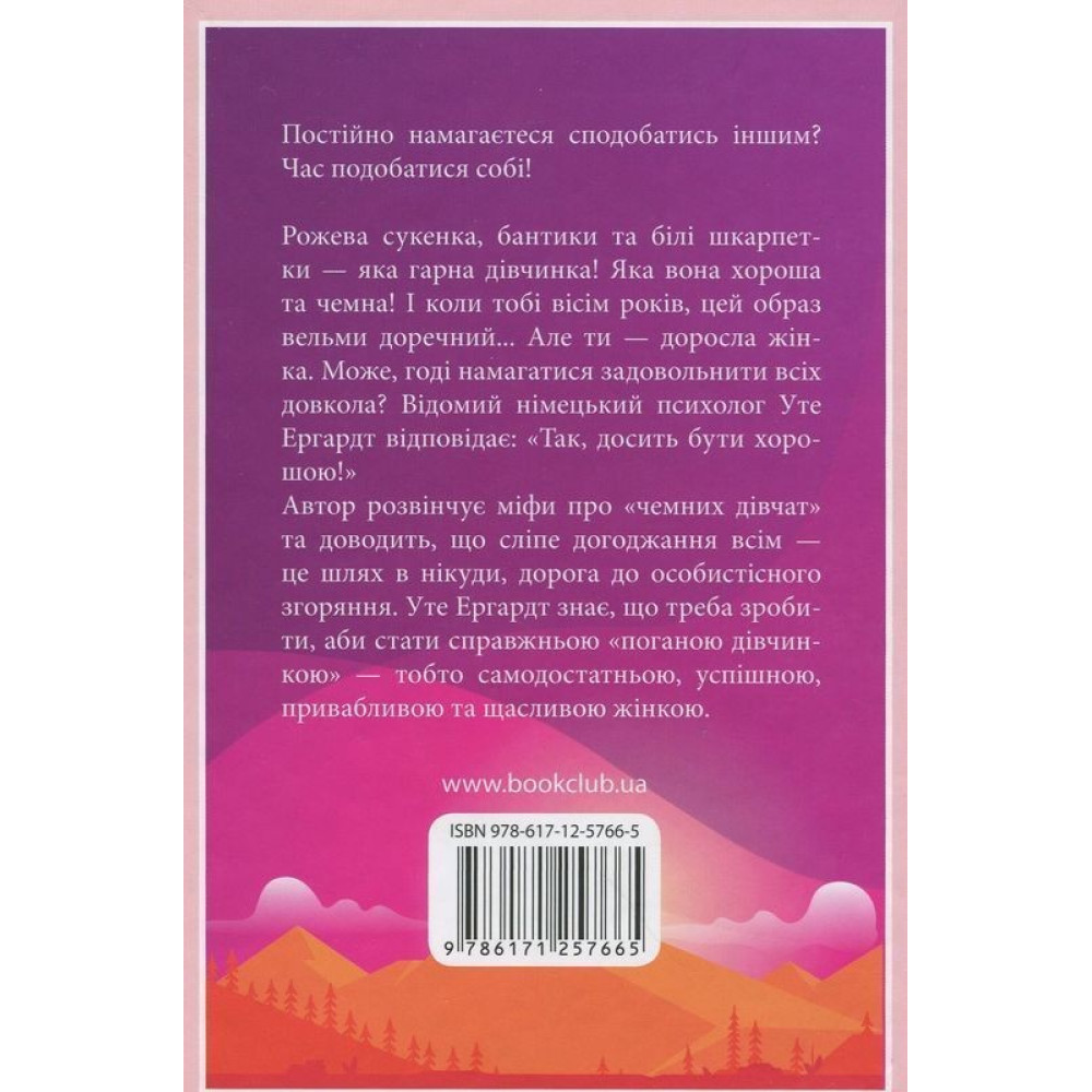 Рожева сукенка, бантики та білі шкарпетки — яка гарна дівчинка! Яка вона хороша та чемна! І коли тобі вісім років, цей образ вельми доречний... Але ти — доросла жінка. Може, годі намагатися задовольнити всіх довкола? Відома німецька психологиня Уте Ергардт на сторінках книжки «Чемні дівчатка потрапляють у Рай, погані — куди забажають» відповідає: «Так, досить бути хорошою!»