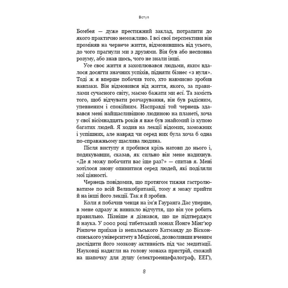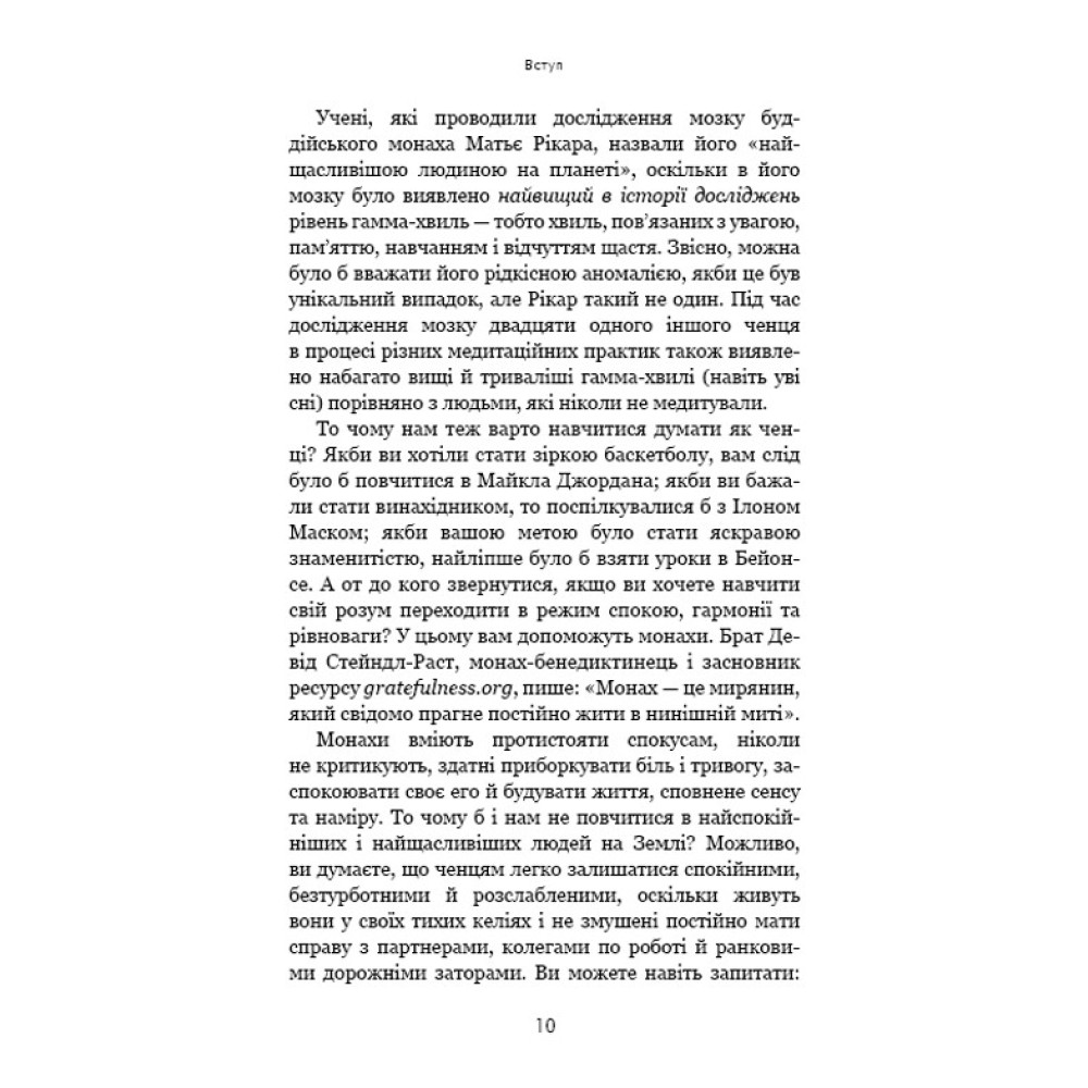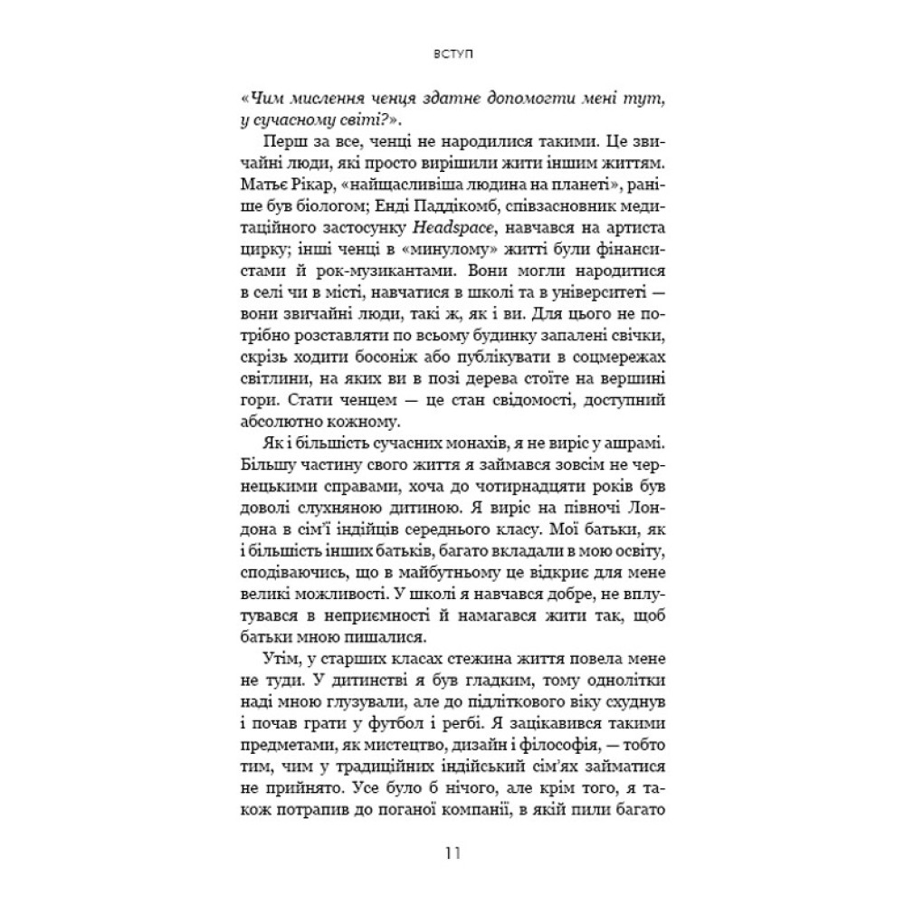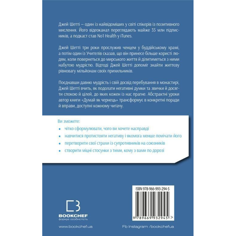 Монахи вміють протистояти спокусам, ніколи не критикують, здатні приборкати біль і тривогу, заспокоювати своє его й будувати життя, сповнене сенсу та наміру. То чому б і нам не повчитися у найспокійніших і найщасливіших людей на землі? Поєднавши давню мудрість і свій досвід перебування в монастирі, Джей Шетті вчить, як подолати негативні думки та звички й досягти спокою і цілей, до яких кожен із нас прагне. Абстрактні уроки Шетті трансформує в конкретні поради й вправи, доступні кожному читачу.