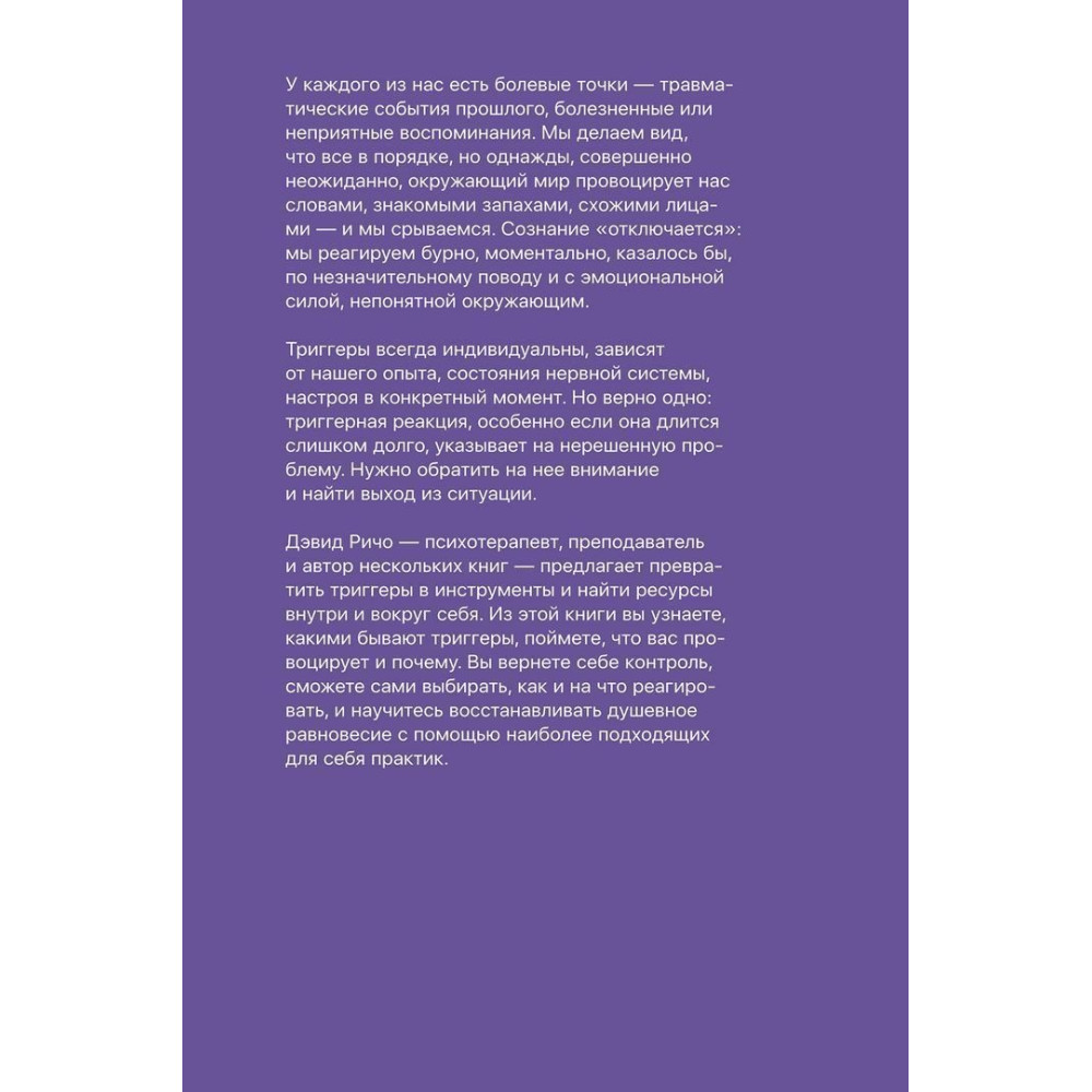 Книга «Эмоциональные триггеры: как понять, что вас огорчает, злит или пугает, и обратить реакцию в ресурс» за авторством Девіда Річо присвячена емоційним тригерам та роботі з ними.