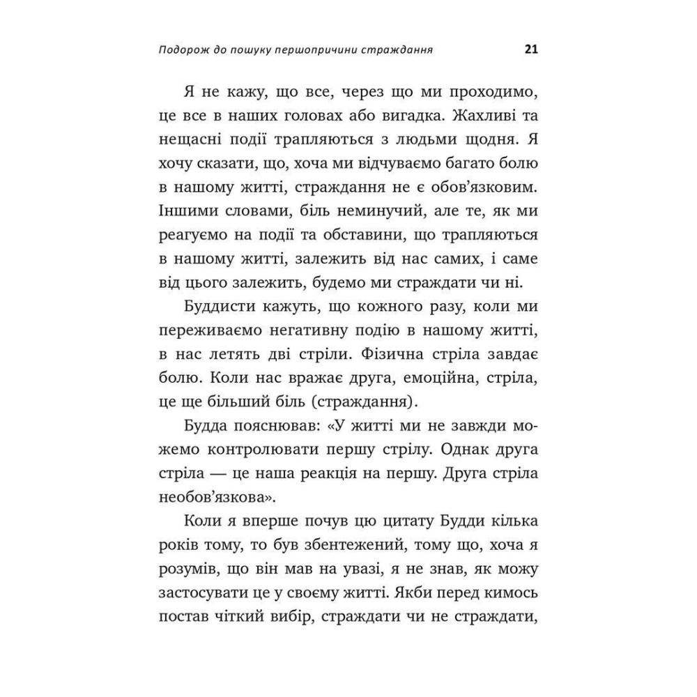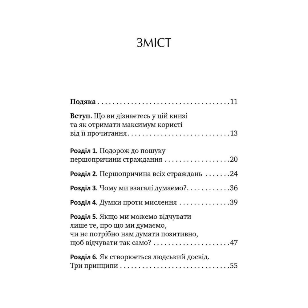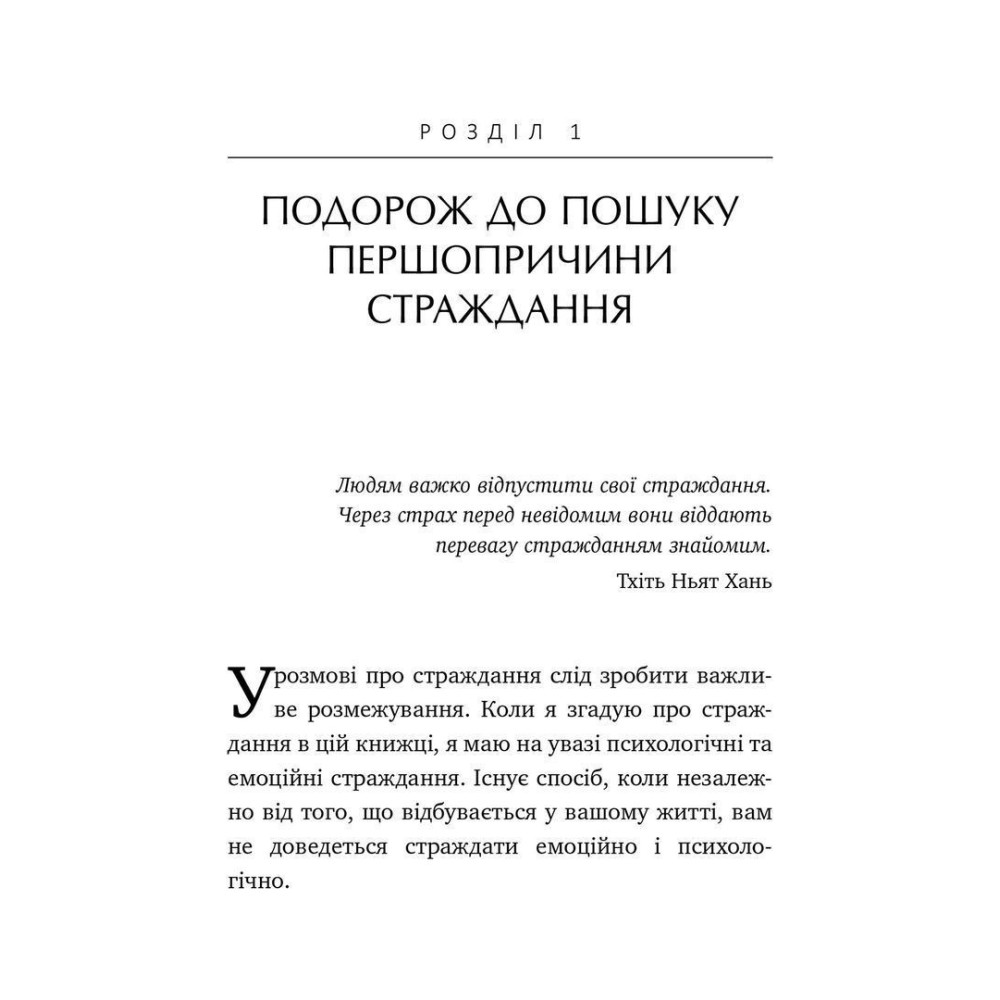 Зміст книги дасть дізнатися про першопричину всіх психологічних та емоційних страждань і про те, як досягти свободи розуму, щоб без зусиль творити життя, про яке ви завжди мріяли, адже страждання не є обов’язковим, попри неминучий біль.