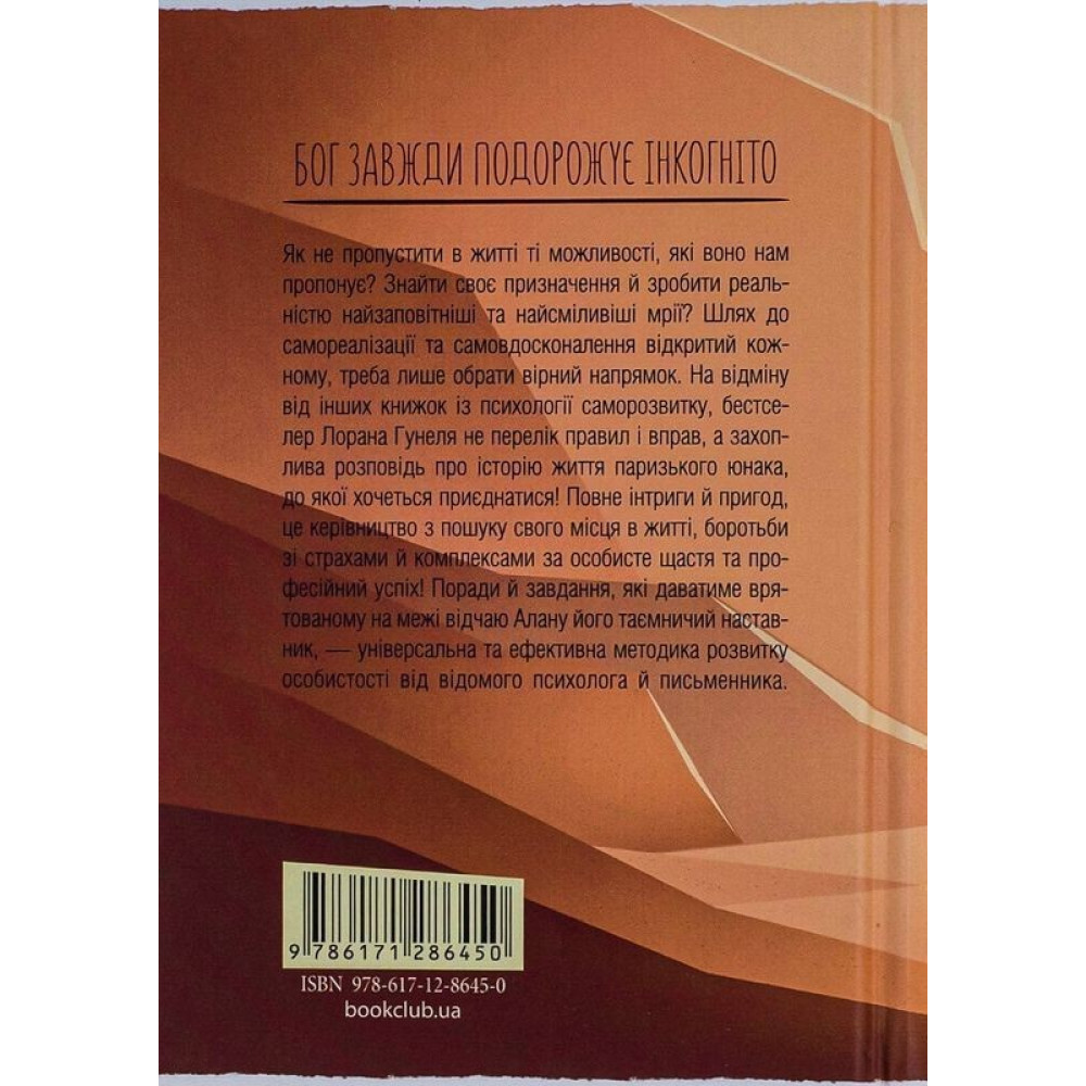 На відміну від інших книжок із психології саморозвитку, бестселер Лорана Гунеля «Бог завжди подорожує інкогніто» — це не перелік правил і вправ, а захоплива розповідь про історію життя паризького юнака, до якої хочеться приєднатися! Повне інтриги й пригод, це керівництво з пошуку свого місця в житті, боротьби зі страхами й комплексами за особисте щастя та професійний успіх. Поради й завдання, які даватиме врятованому на межі відчаю Алану його таємничий наставник, — універсальна та ефективна методика розвитку особистості від психолога та письменника Лорана Гунеля.