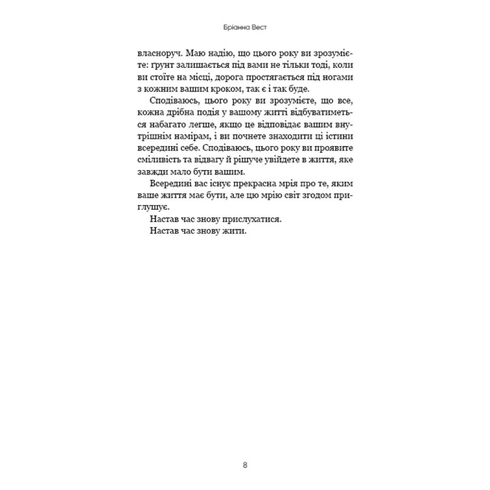 «Ви стаєте собою, коли починаєте вибирати справді важливе й цінне для вас», — стверджує Бріанна Вест у своєму черговому бестселері «Переломний рік. 365 днів, щоб стати людиною, якою ви справді хочете бути». Вона точно знає, наскільки значними й непереборними можуть бути перешкоди, які заважають жити тим життям, якого хочемо саме ми, а не родичі, друзі чи оточення, або ж до якого нас спонукають зовнішні обставини.