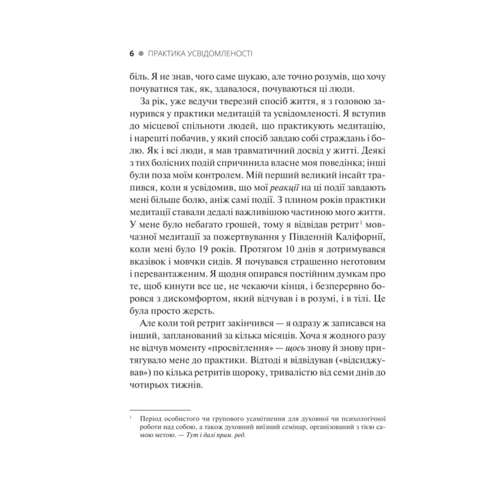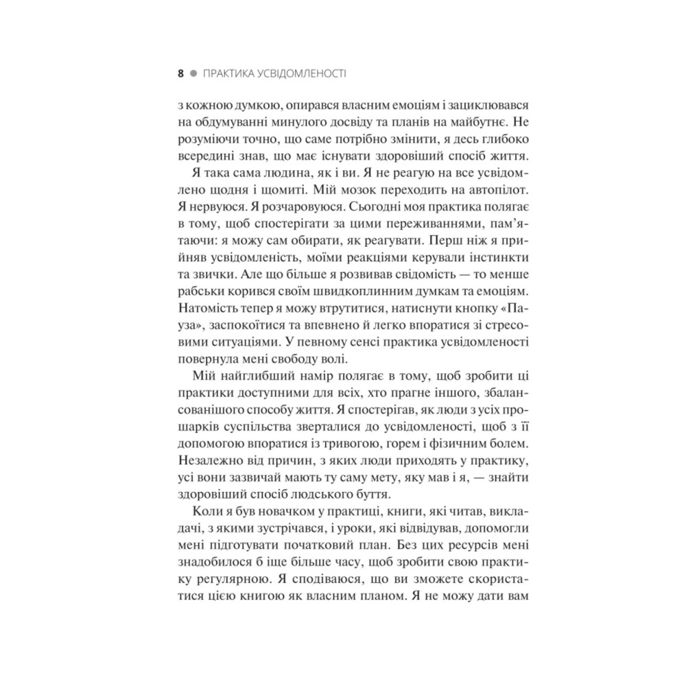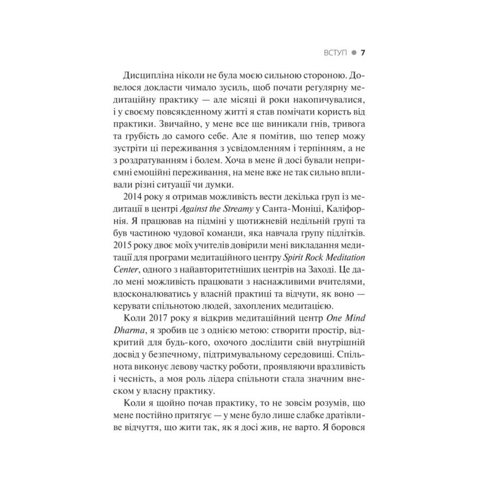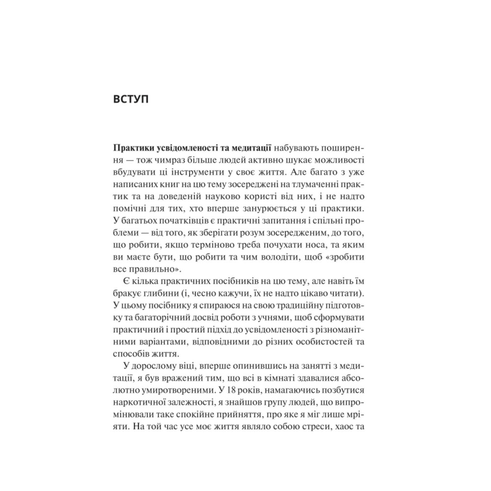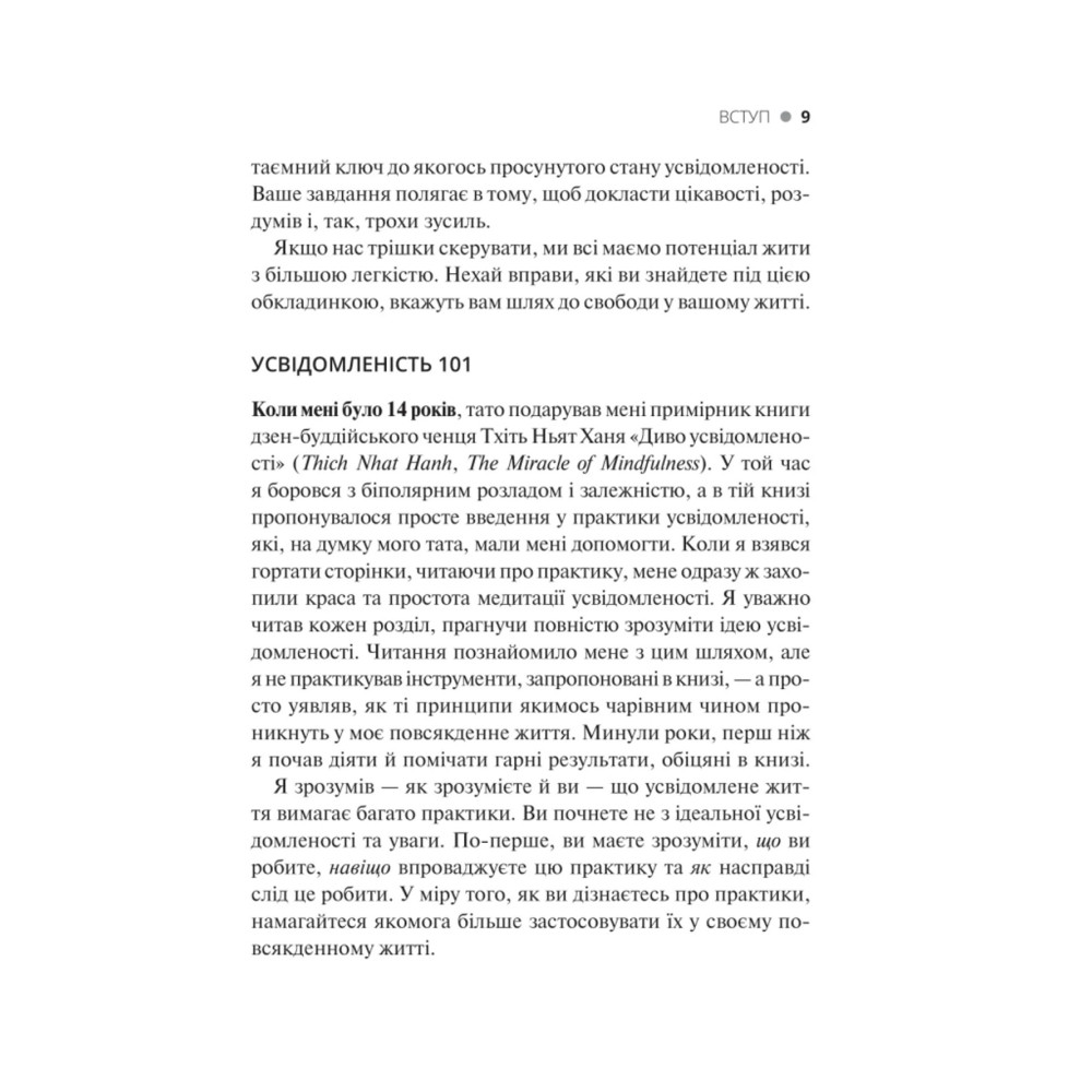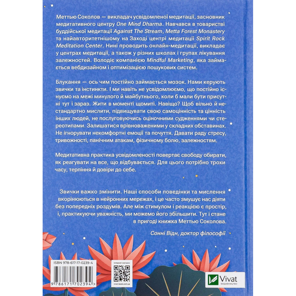 Блукання — ось чим постійно займається мозок. Нами керують звички та інстинкти. І ми навіть не усвідомлюємо, що постійно існуємо на межі минулого й майбутнього, коли б мали бути присутні тут і зараз. Жити в моменті щомиті. Навіщо? Щоб вільно й нестандартно мислити, підвищувати свою самоцінність та цінність інших людей, не послуговуючись оціночними судженнями чи стереотипами. Залишатися врівноваженими у складних обставинах. Не ігнорувати некомфортні емоції та почуття. Давати раду стресу, тривожності, панічним атакам, фізичному болю, залежностям.