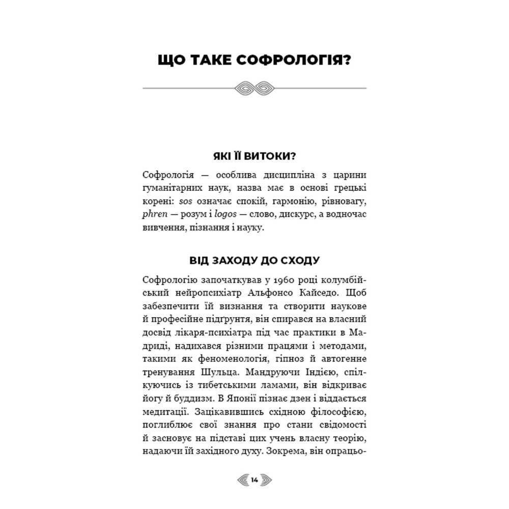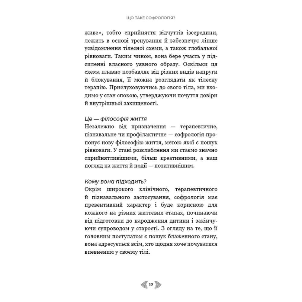 «Примирення душі й тіла. 40 простих вправ за методом софрології» від Мішель Фройд охоплює софрологію — метод пізнання й потужний інструмент, що об’єднує техніки, характерні як для західної, так і для східної культур. Софрологія допомагає перетворити тривоги й страхи на позитивні думки, знайти приховані ресурси й поліпшити якість життя, без зайвих втрат пережити складні життєві обставини.