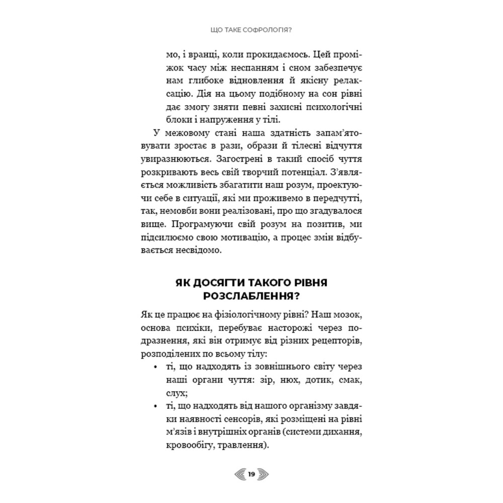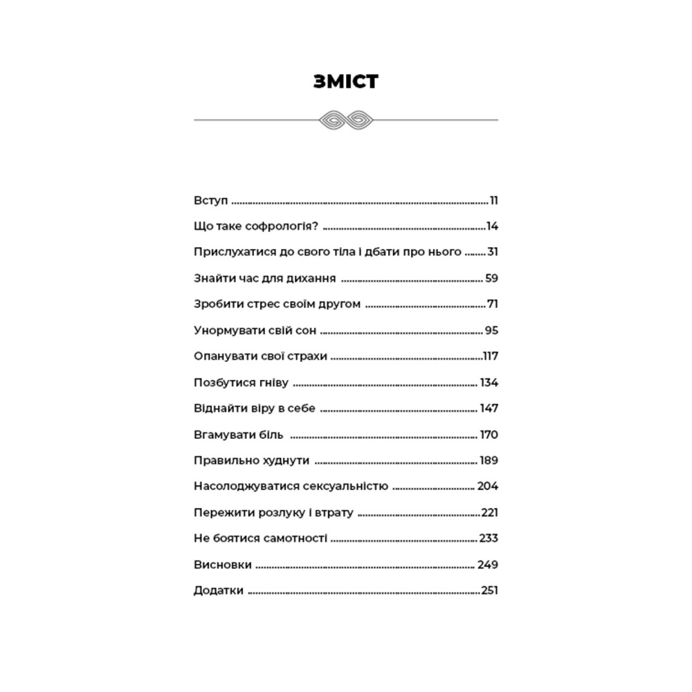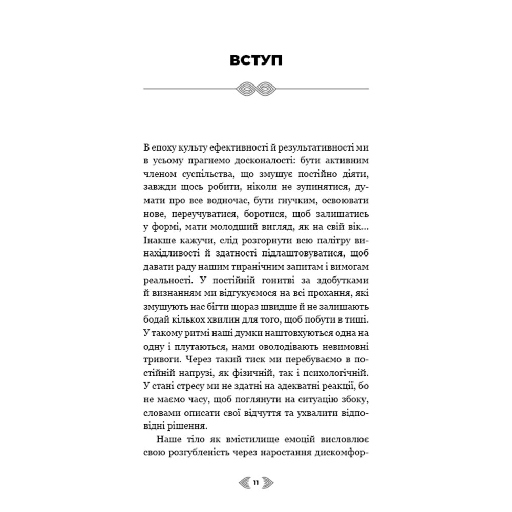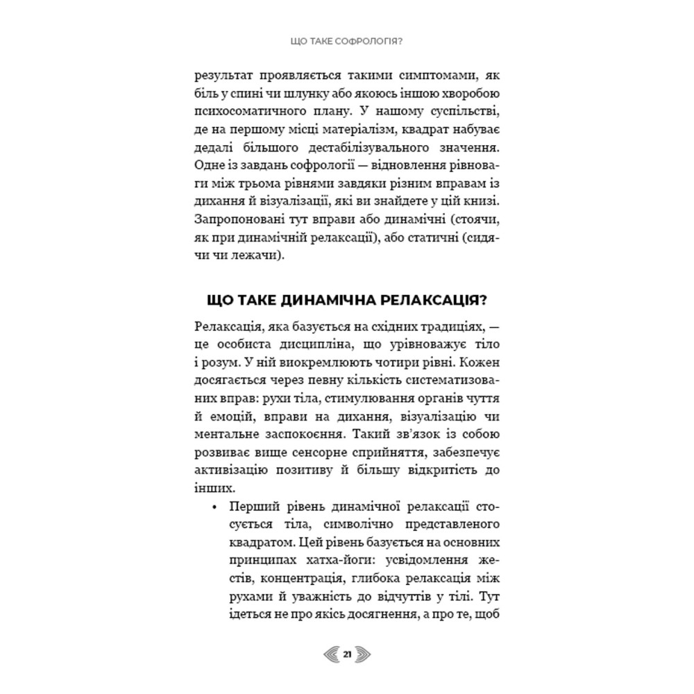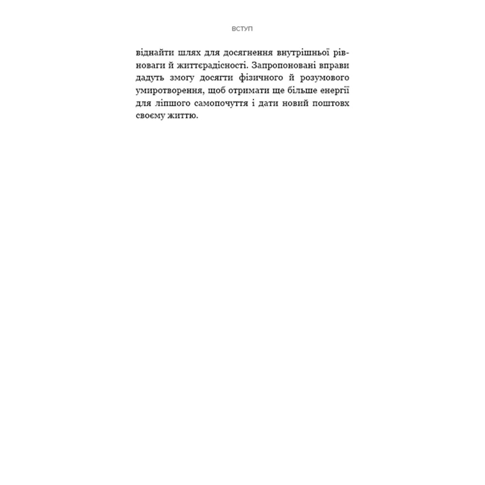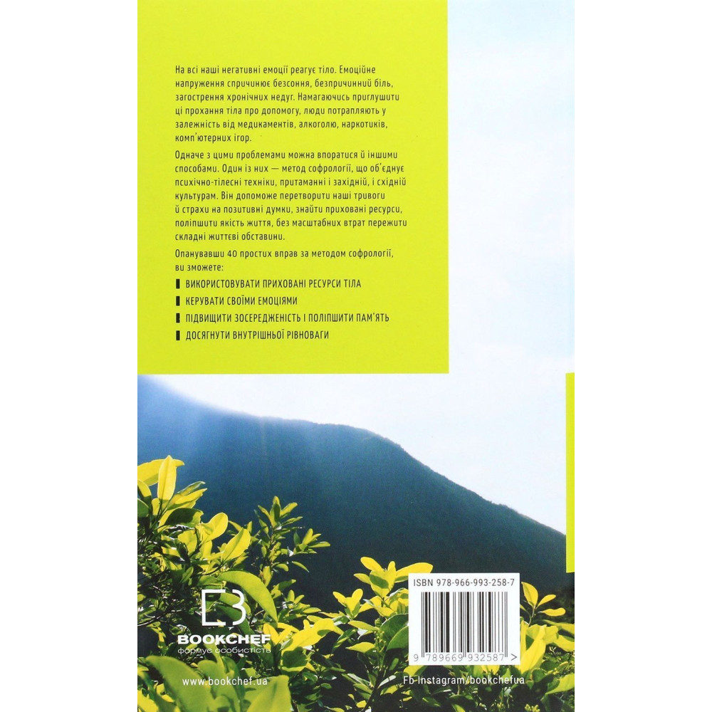 Авторка пропонує добірку із 40 вправ, опанування якими дасть змогу достойно впоратися із життєвими проблемами; відновити впевненість у собі, а відтак вдало скласти іспит чи виступити на публіці; подолати стрес, утому та безсоння й повернути радість життя.