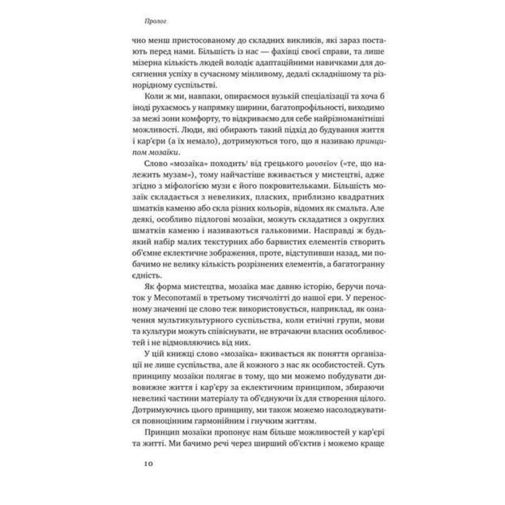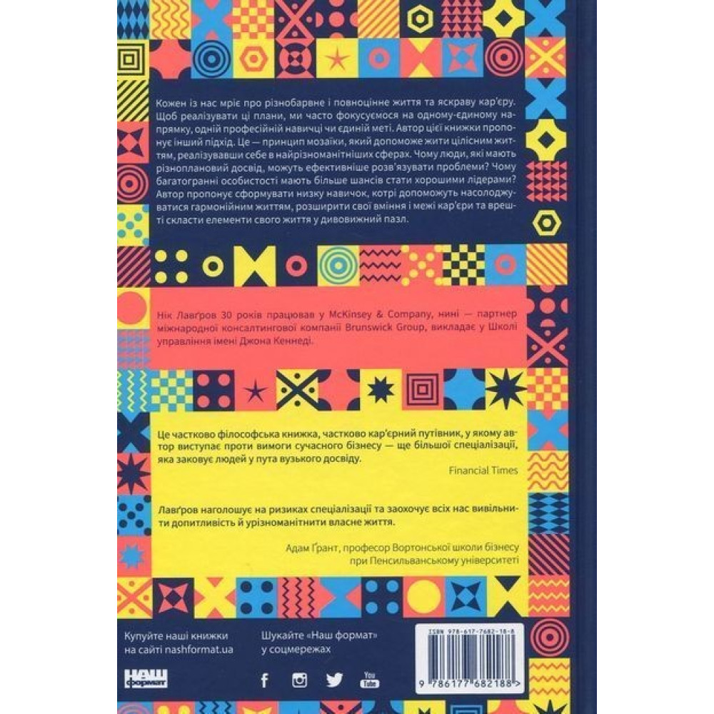 Кожен із нас мріє про різнобарвне і повноцінне життя та яскраву кар’єру. Щоб реалізувати ці плани, ми часто фокусуємося на одному-єдиному напрямку, одній професійній навичці чи єдиній меті. Нік Лавґров пропонує інший підхід, який описано у книзі «Принцип мозаїки. Шість навичок дивовижного життя і кар'єри»: це принцип мозаїки, який допоможе жити цілісним життям, реалізувавши себе в найрізноманітніших сферах.