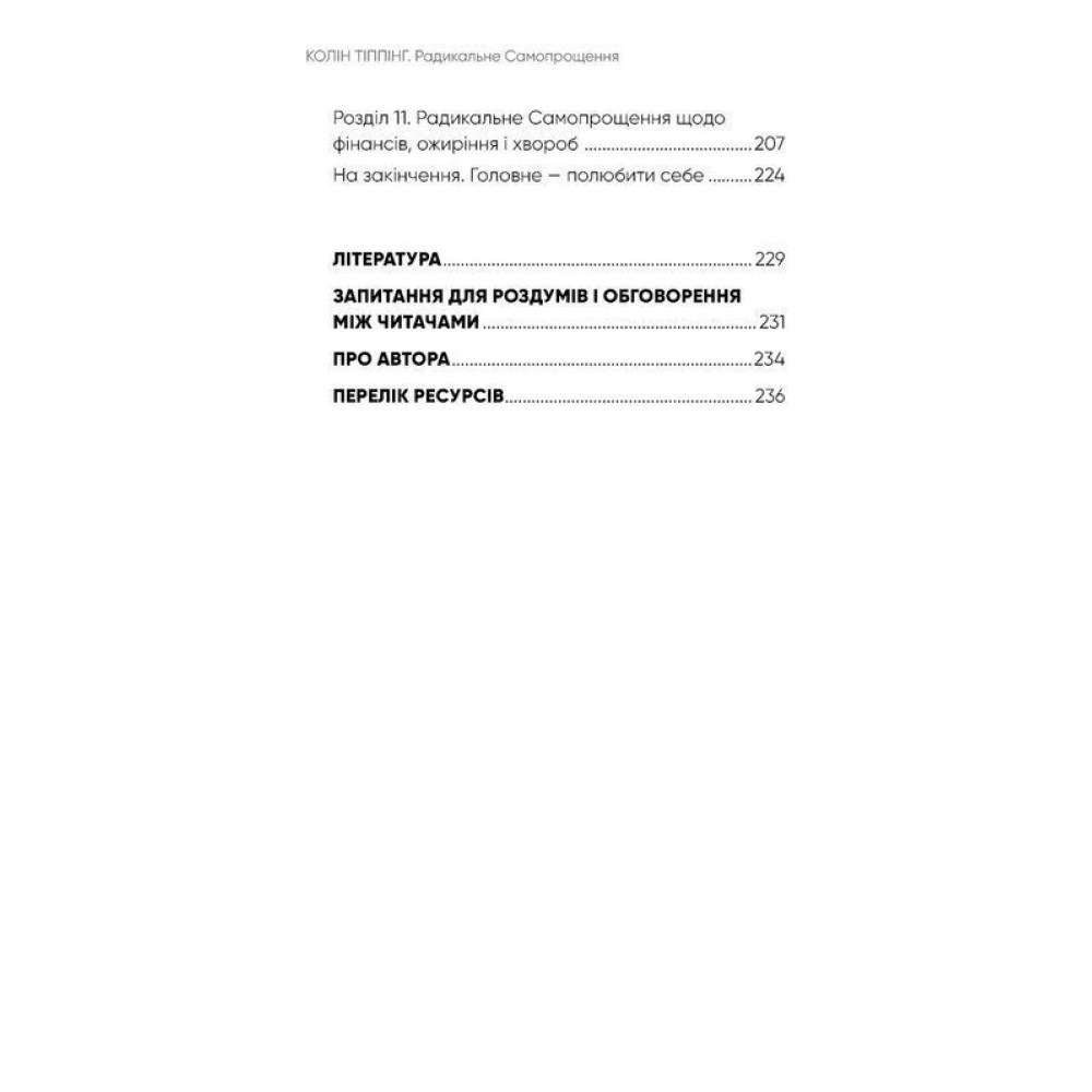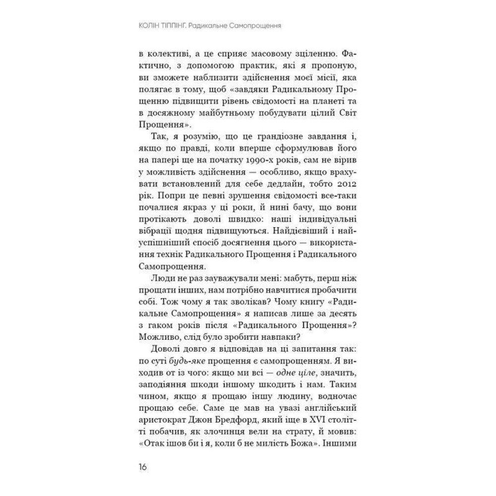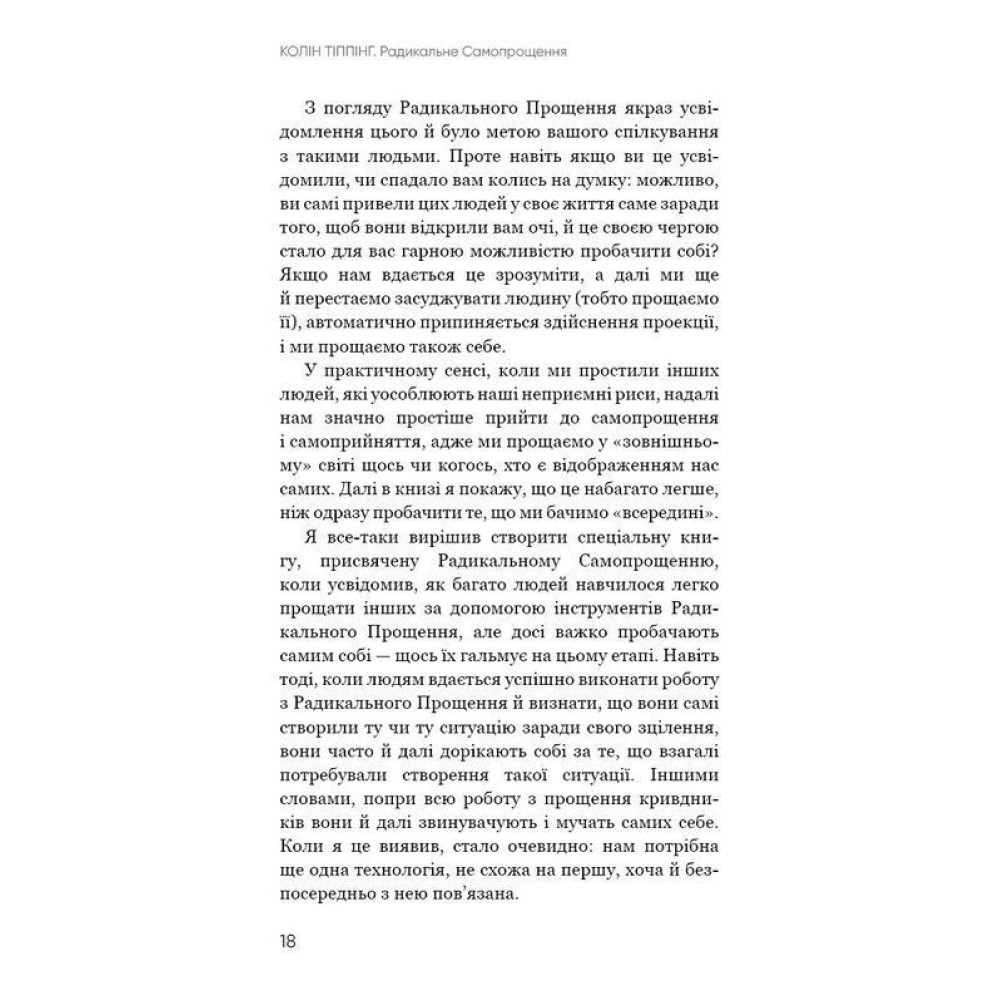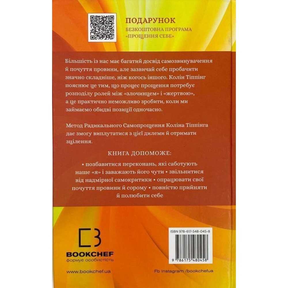 Ґрунтуючись на відомому в усьому світі авторському методі Радикального Прощення, Колін Тіппінг розробив п’ять ступенів Радикального Самопрощення, опрацювавши які, читач зможе кардинально змінити своє ставлення до життя, проблем, ситуацій, людей, а головне — до самого себе.