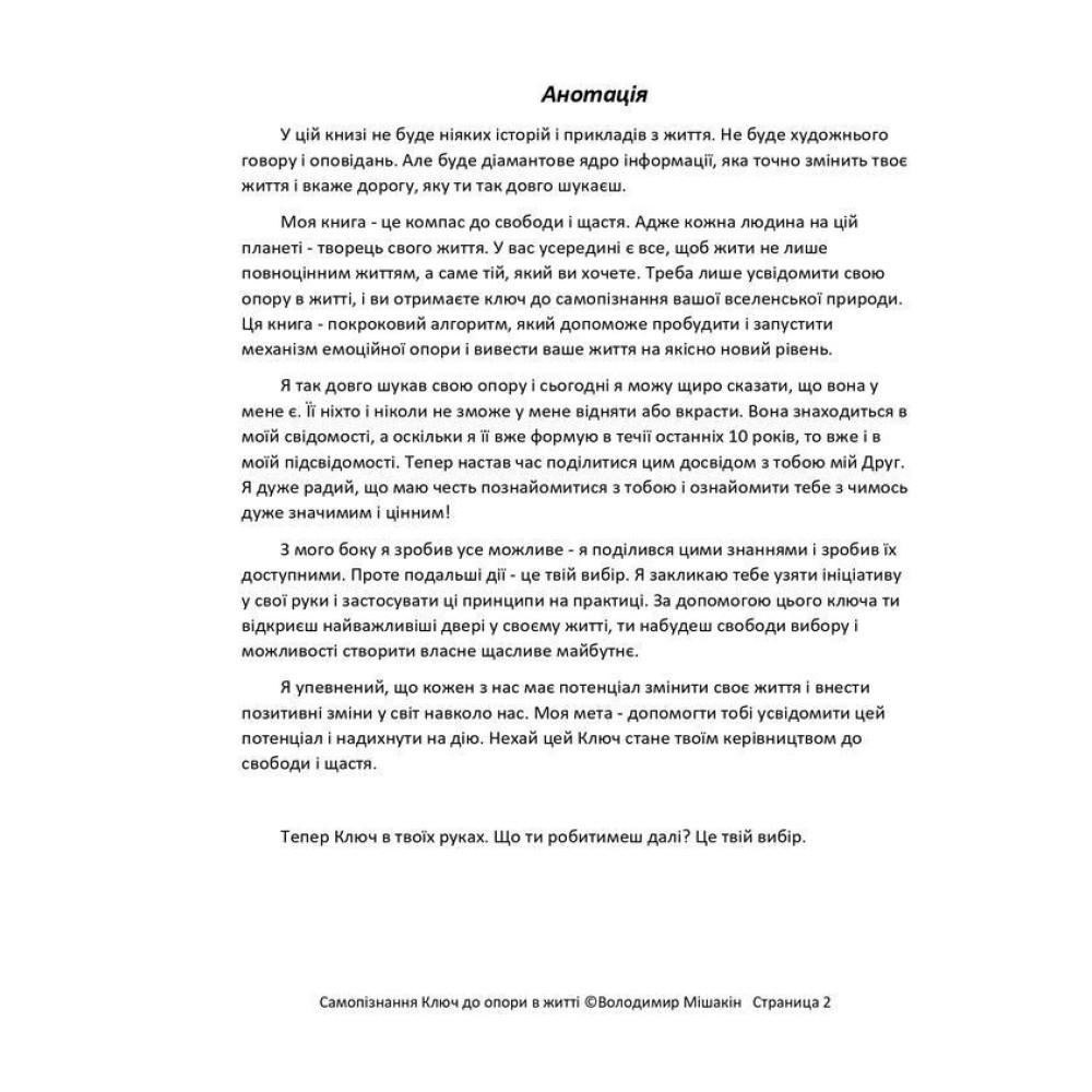 Я упевнений, що кожен з нас має потенціал змінити своє життя і внести позитивні зміни у світ навколо нас. Моя мета — допомогти тобі усвідомити цей потенціал і надихнути на дію. Нехай цей Ключ стане твоїм керівництвом до свободи і щастя».