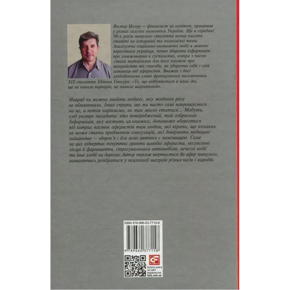 Інформація, яку містить книжка «Шахрайство на кожному кроці: кохання, машина і медицина» від Віктора Мазура, допоможе вберегтися від хитрих пасток аферистів тим людям, які вірять, що кохання не може стати предметом спекуляцій, які довіряють медицині найцінніше – здоров’я і для яких автівка є помічницею.