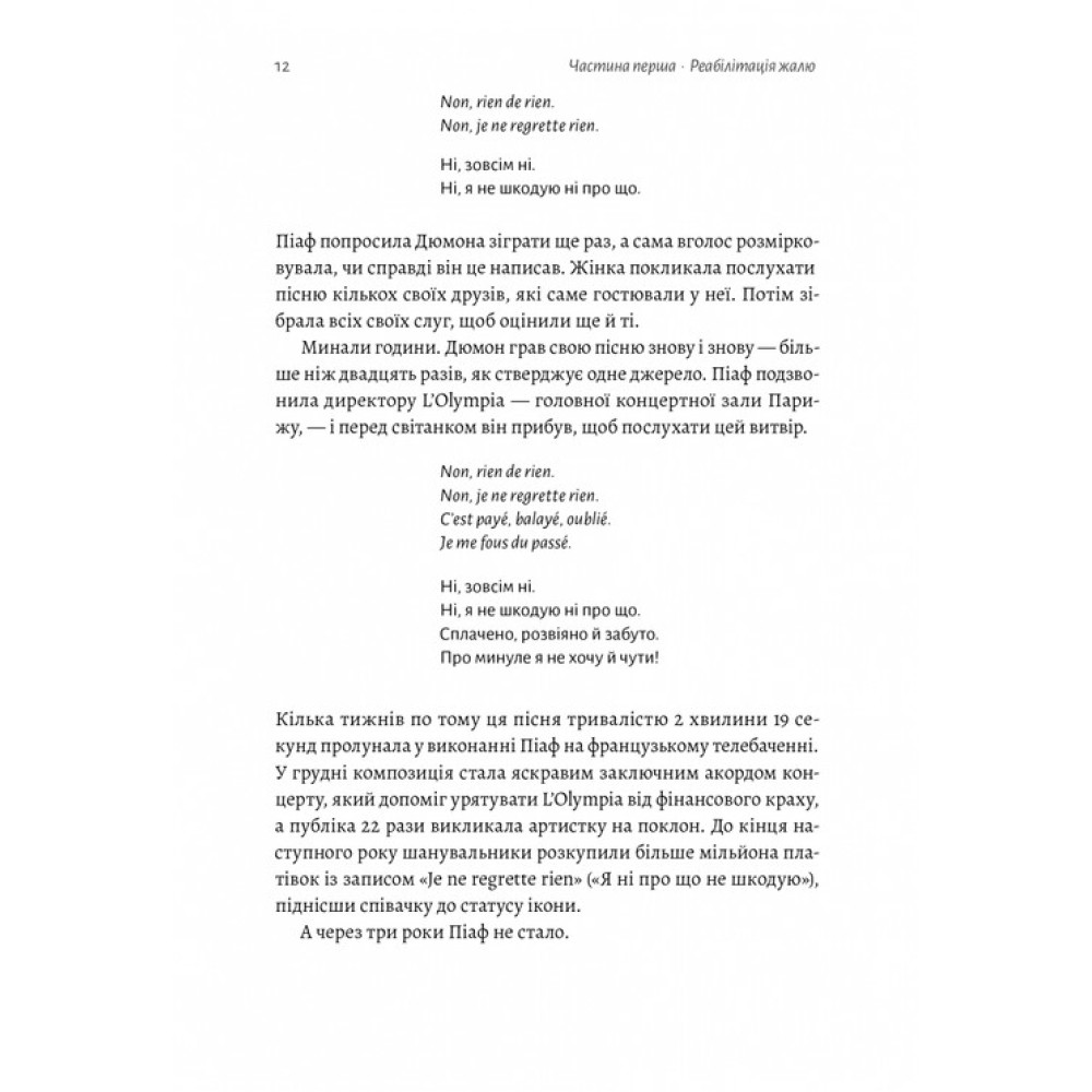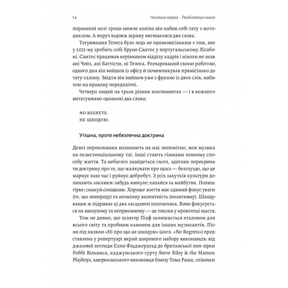 Опираючись на дослідження в галузі соціальної психології, неврології та біології, автор доводить, що неможливо ні про що не шкодувати. У книжці він використовує найбільшу статистичну вибірку ставлення американців до жалю, яку коли-небудь проводили, а також власне Всесвітнє дослідження жалю, у якому взяло участь 15 000 людей у 105 країнах.