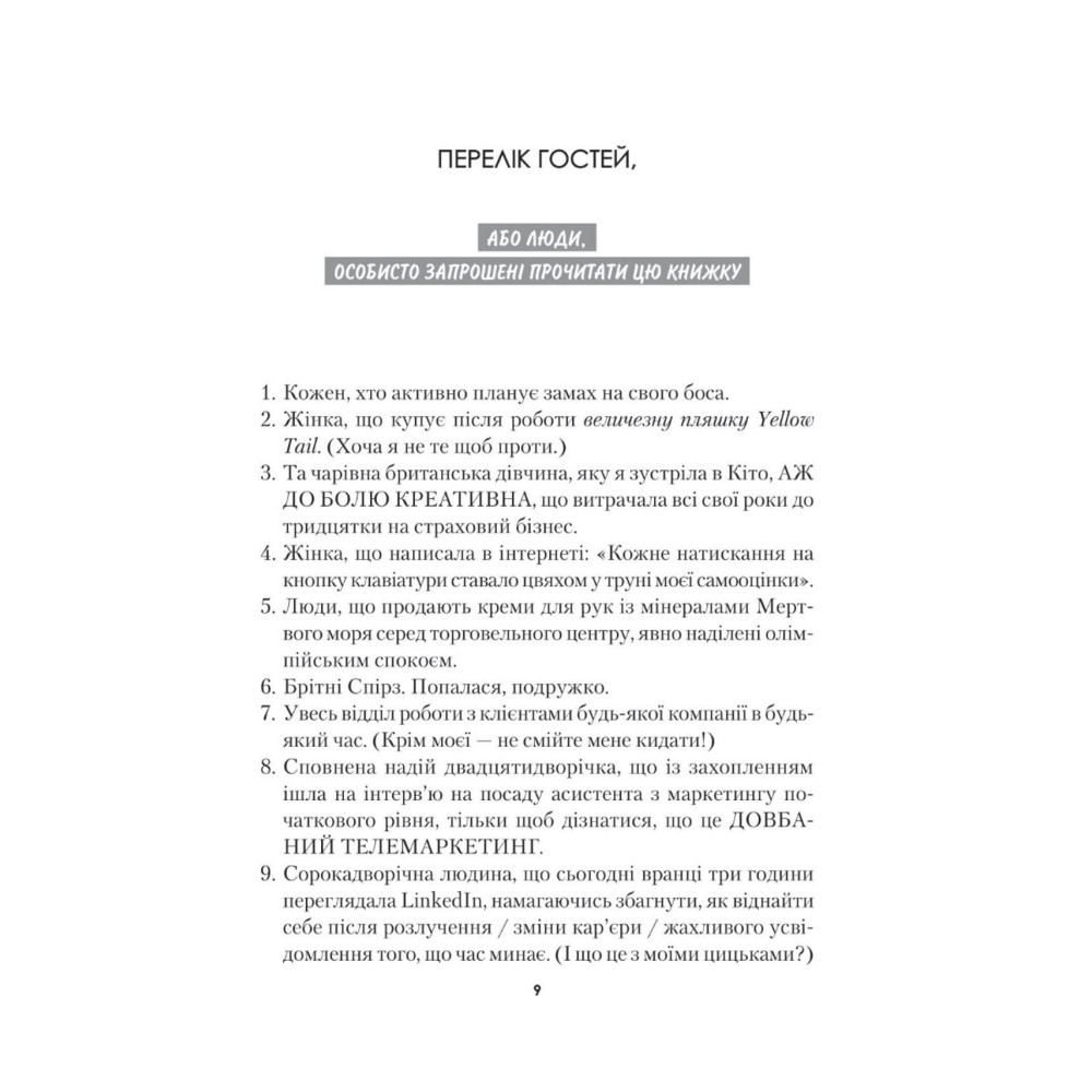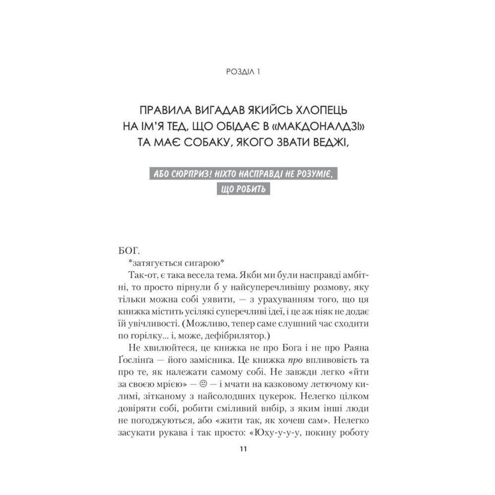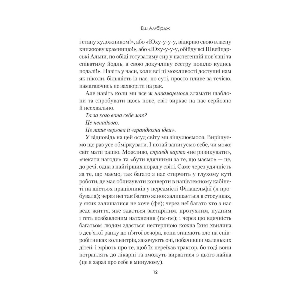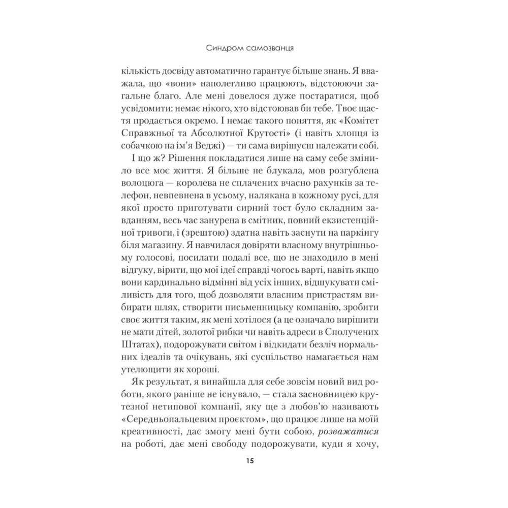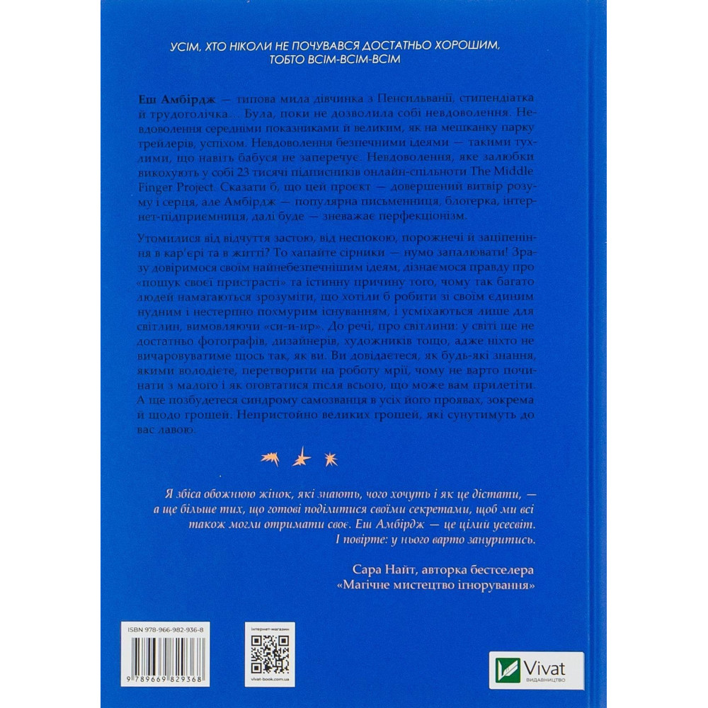 У своїй книжці вона виклала сміливі, іноді навіть зухвалі поради й інструкції, які допоможуть вам позбутися синдрому самозванця і повірити у власні сили. Разом із нею ви навчитеся сміливо довіряти своїм ідеям, дізнаєтеся, що є вашою справжньою пристрастю та зрозумієте, чому навколо так багато втомлених людей, які посміхаються лише на світлинах в інстаграмі.