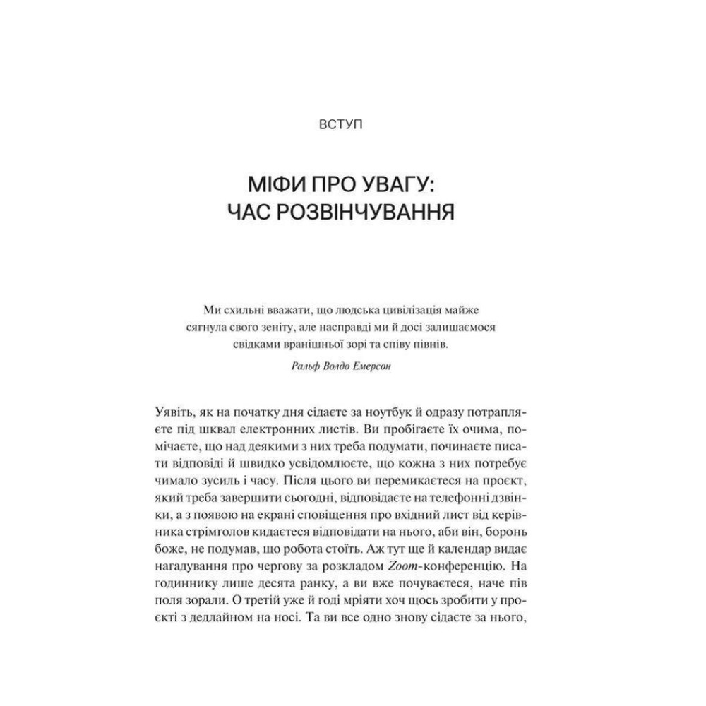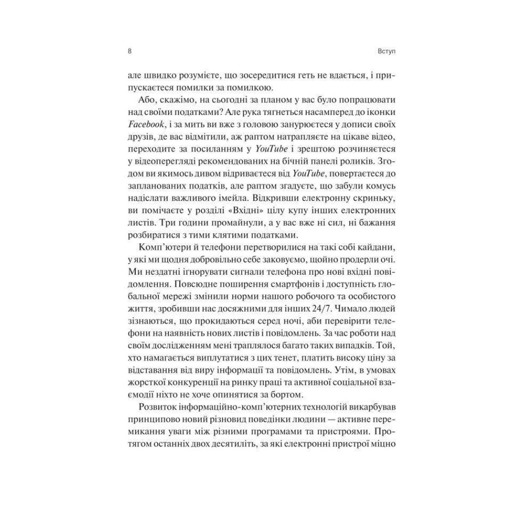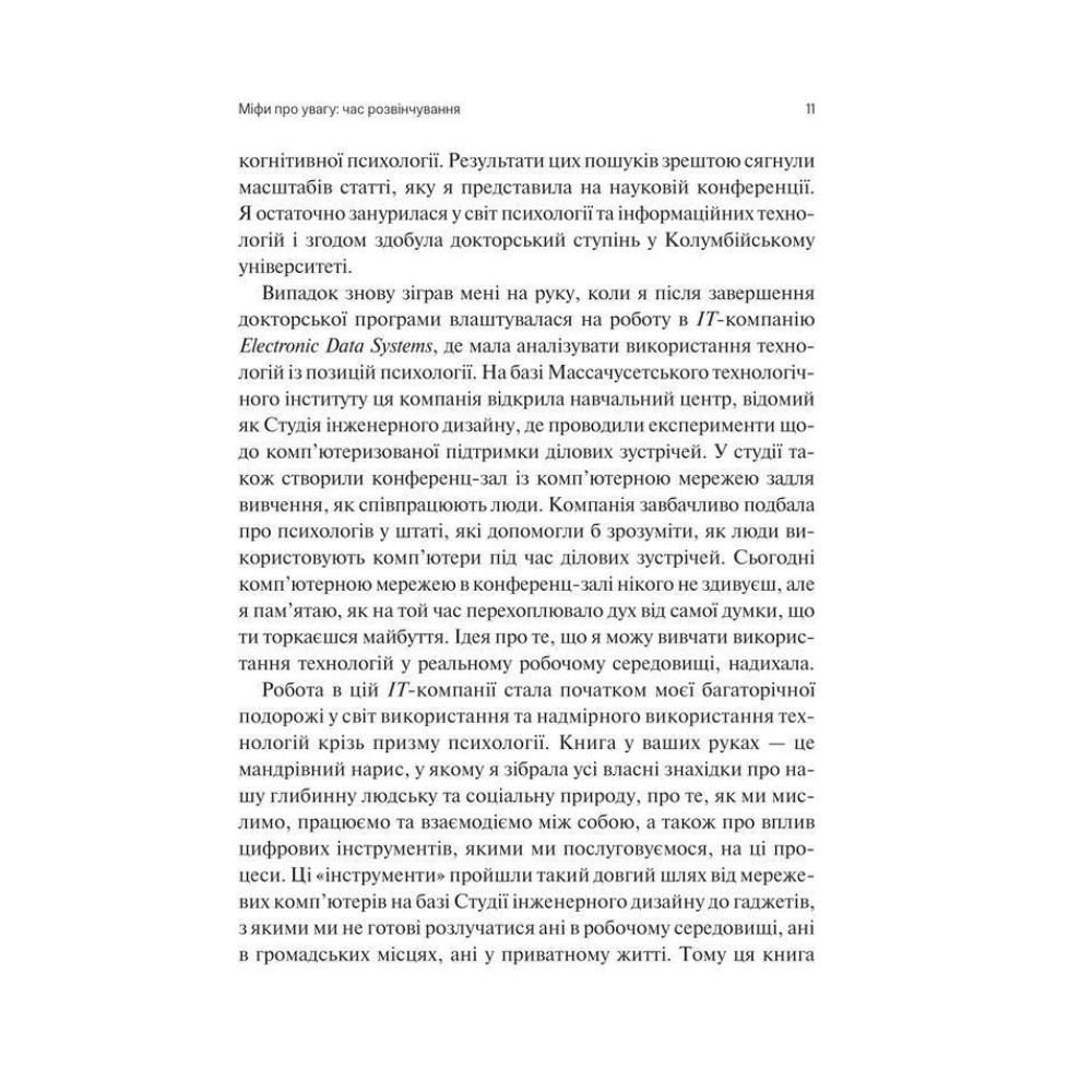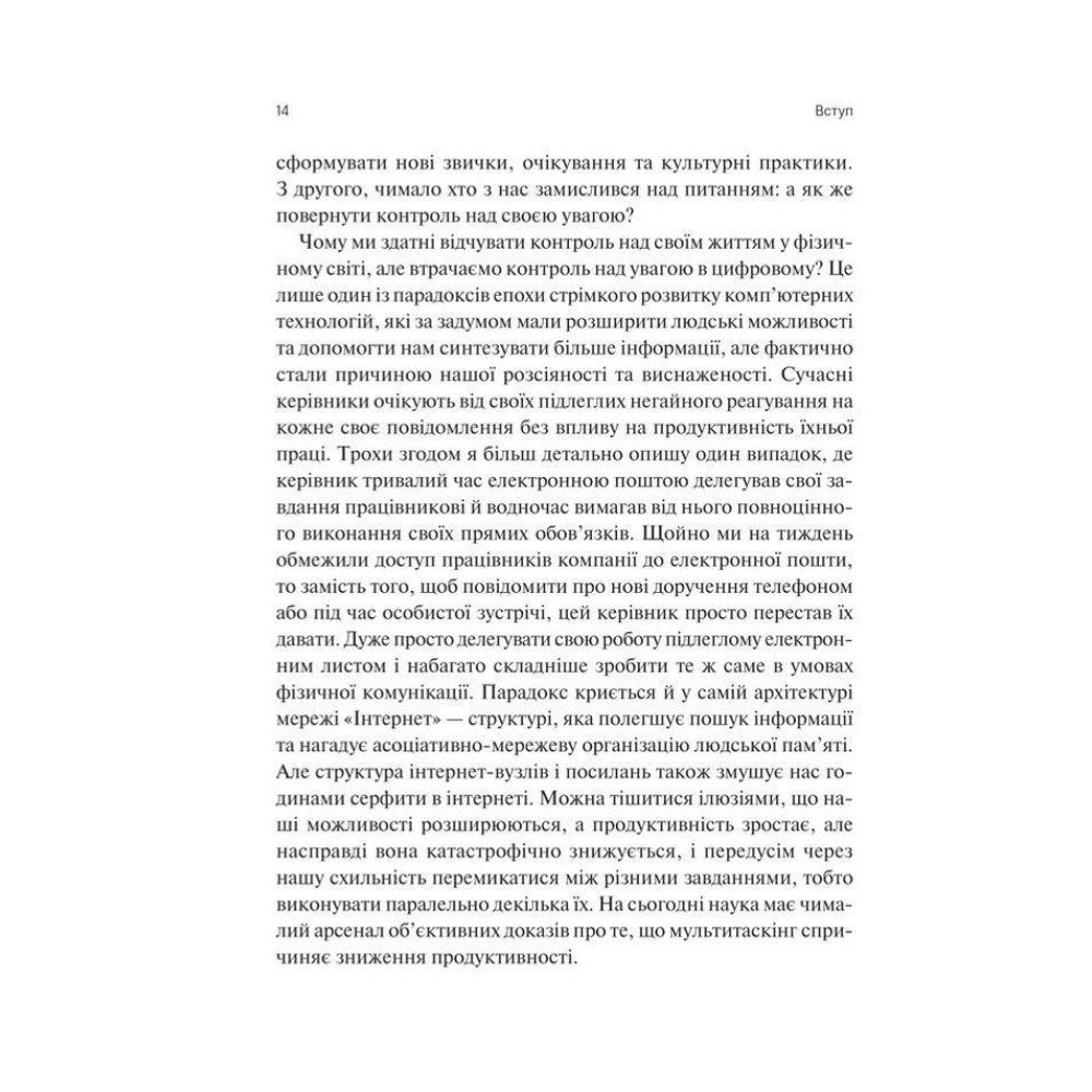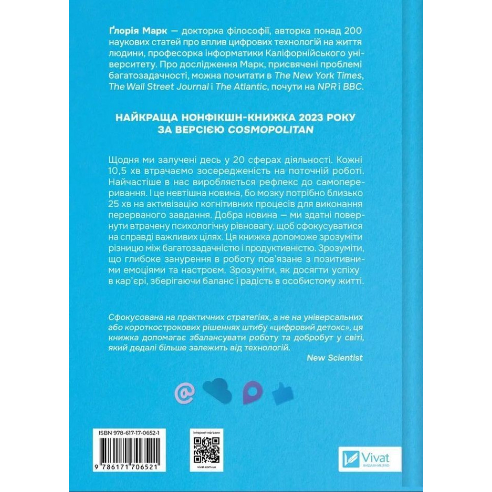 У ході аналізу великої кількості наукових досліджень і власних експериментів, авторка з'ясувала: в межах реалізації паралельних завдань відбувається скорочення уваги. Потрібно тримати баланс між якісними й кількісними показниками інтелектуальних операцій — і Ґлорія Марк поділиться порадами щодо збереження цієї гармонії, які сформувала на підставі фактів.