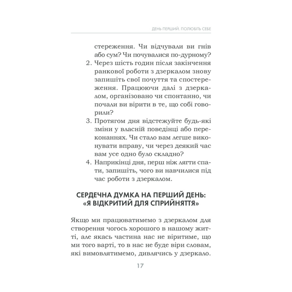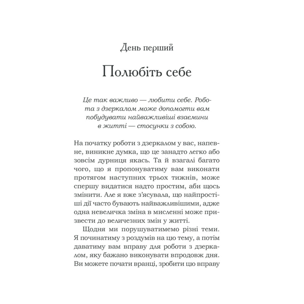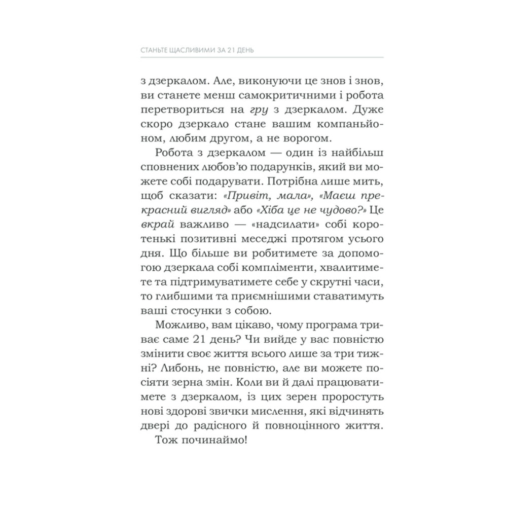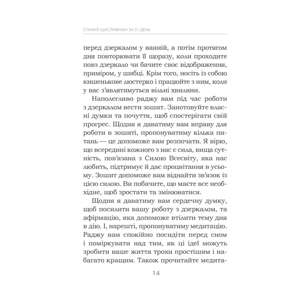 За три тижні можна змінити мислення, звички та погляди. Кожен день у книзі присвячено певній темі: прийняття себе, подяка, прощення, довіра, візуалізація, медитація, відпускання минулого тощо.