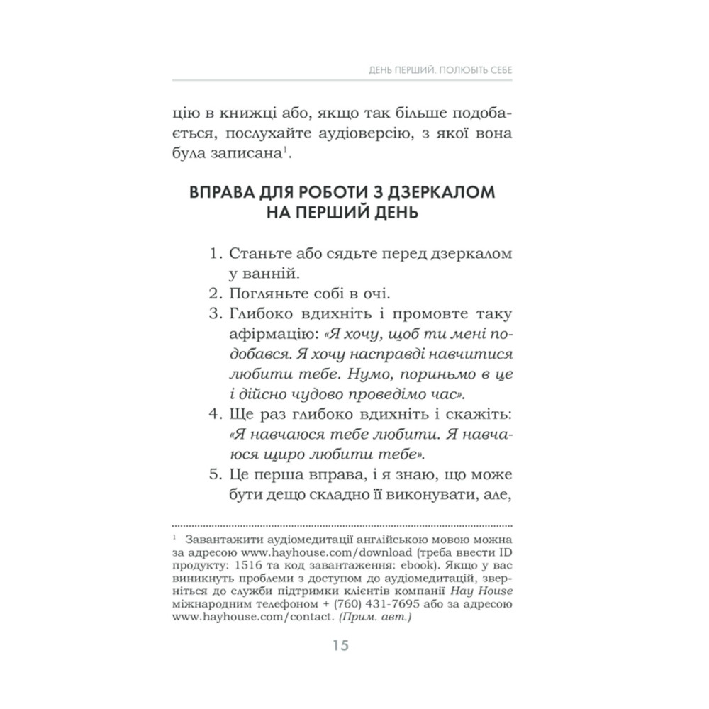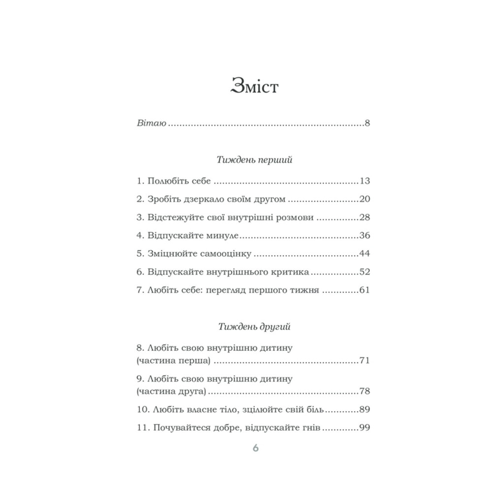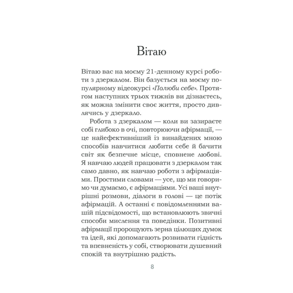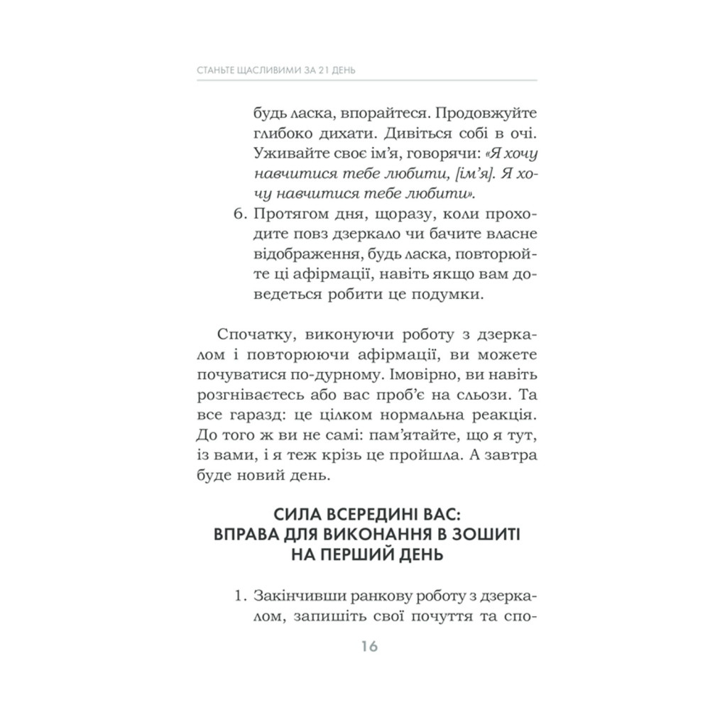 За три тижні можна змінити мислення, звички та погляди. Кожен день у книзі присвячено певній темі: прийняття себе, подяка, прощення, довіра, візуалізація, медитація, відпускання минулого тощо.