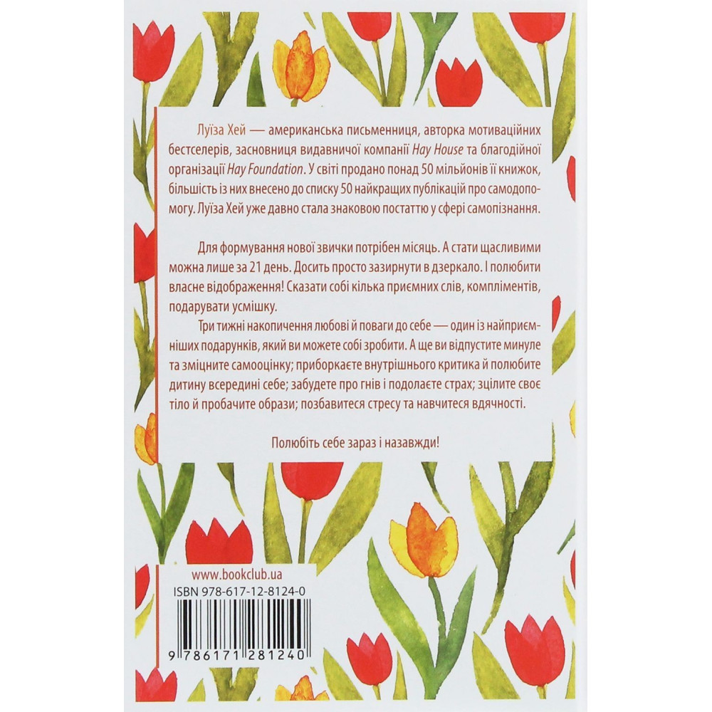 Книга «Станьте щасливими за 21 день. Усміхайся та змінюйся» від Луїзи Хей — це надихаючий практичний посібник, який допомагає читачам усього за три тижні змінити своє життя, налаштуватися на позитив і відкритися щастю. Луїза Хей — всесвітньо відома авторка, метафізикиня, духовна вчителька та засновниця видавництва Hay House — пропонує свою унікальну методику самозцілення через аффірмації, любов до себе та внутрішнє прийняття.