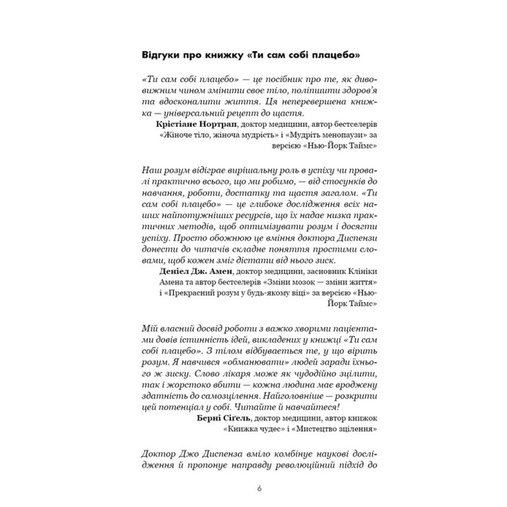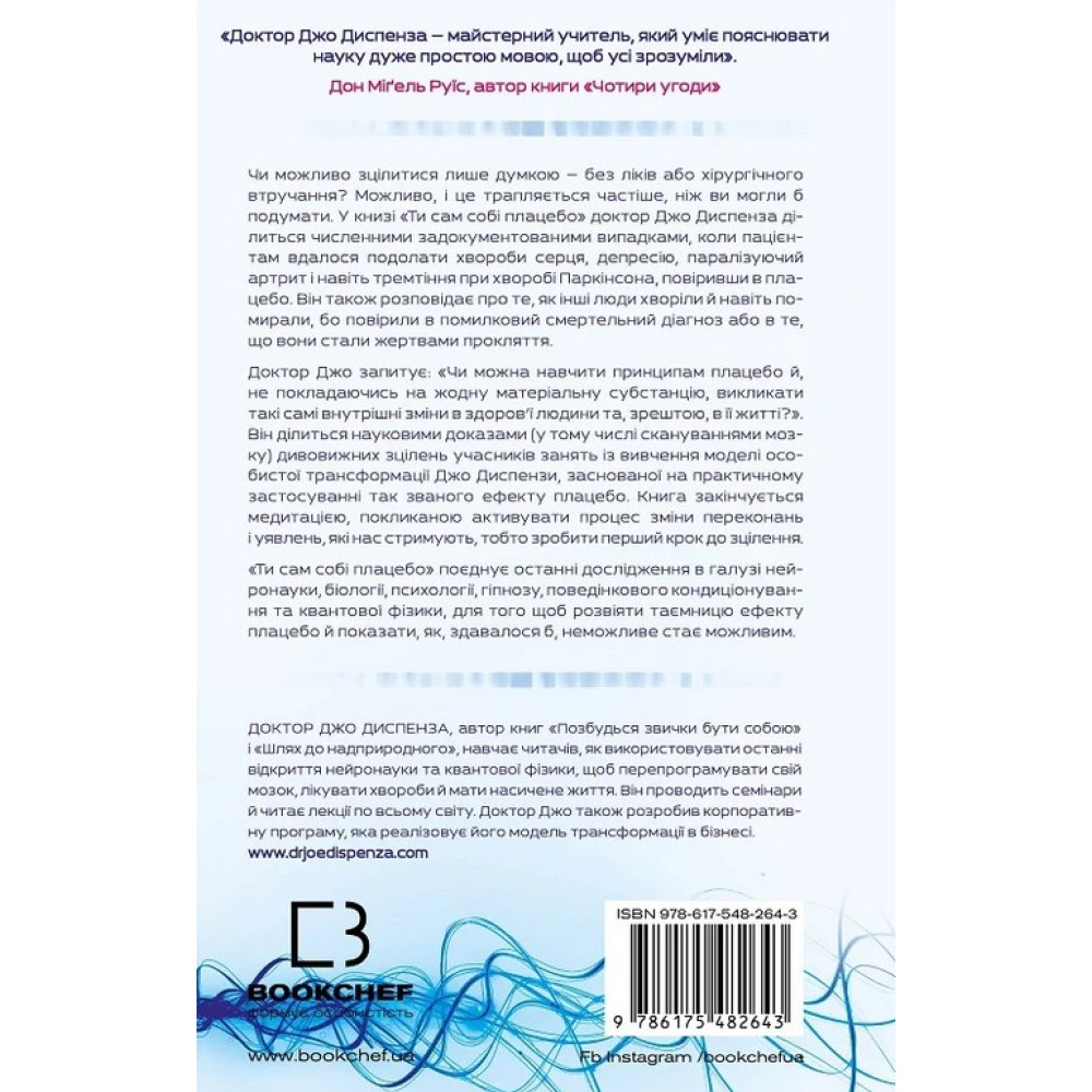 Автор світових бестселерів із розвитку мозку, професор нейрохімії та нейробіології, доктор Джо Диспенза пояснює у книзі «Ти сам собі плацебо. Перетвори свій розум на ліки», як працює плацебо з наукової точки зору, і доводить, що тіло має здатність до самозцілення — без препаратів або хірургічного втручання.