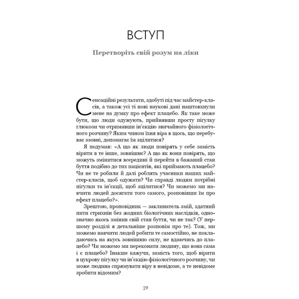 Книга поєднує останні дослідження в галузі нейронауки, біології, психології, гіпнозу, поведінкового кондиціонування та квантової фізики, для того щоб розвіяти таємницю ефекту плацебо й показати, як, здавалося б, неможливе стає можливим.