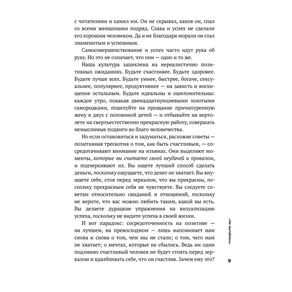 Марк Менсон, автор книги «Тонкое искусство пофигизма. Парадоксальный способ жить счастливо» прекрасно обізнаний стосовно того, що сучасне суспільство постійно пропагує культ успіху: будь розумнішим, багатшим, продуктивнішим — будь кращим за всіх. Соцмережі рясніють історіями на тему, як якийсь малий вигадав застосунок і заробив купу грошей, статтями на кшталт «Тисяча і один спосіб бути щасливим», а фото у френдстрічці створюють враження, що оточуючі живуть краще й цікавіше, ніж ми. Однак наша зацикленість на позитиві та успіху лише нагадує про те, чого ми не досягли, про мрії, які не збулися.