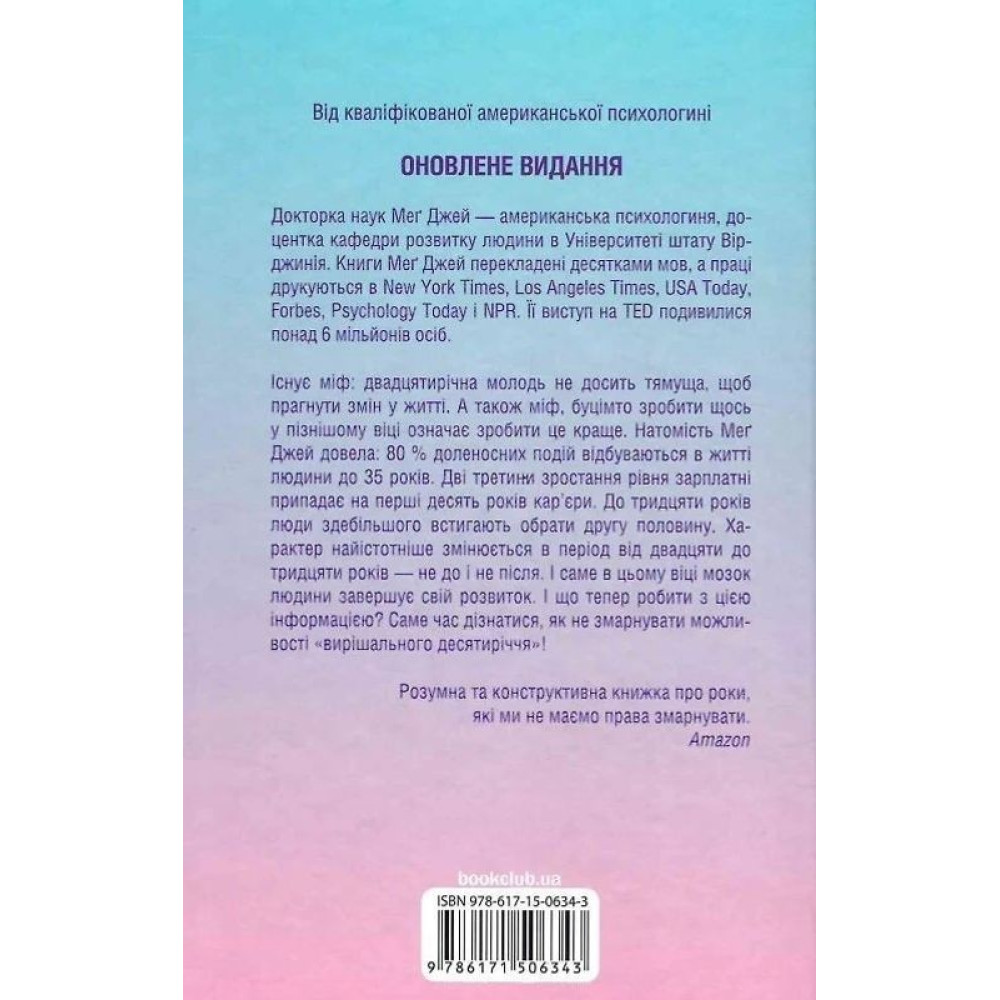 Існує міф, що юнакам і дівчатам, яким минуло двадцять, бракує тямущості, щоб цікавитись інформацією, здатною змінити життя. І міф про те, буцімто тридцять — це нові двадцять і зробити щось у пізнішому віці означає зробити це краще. Натомість Меґ Джей у книжці «Визначні роки. Як перетворити хороші шанси на великі можливості» доводить факт, що 80 % доленосних подій відбуваються в житті людини до 35 років.
