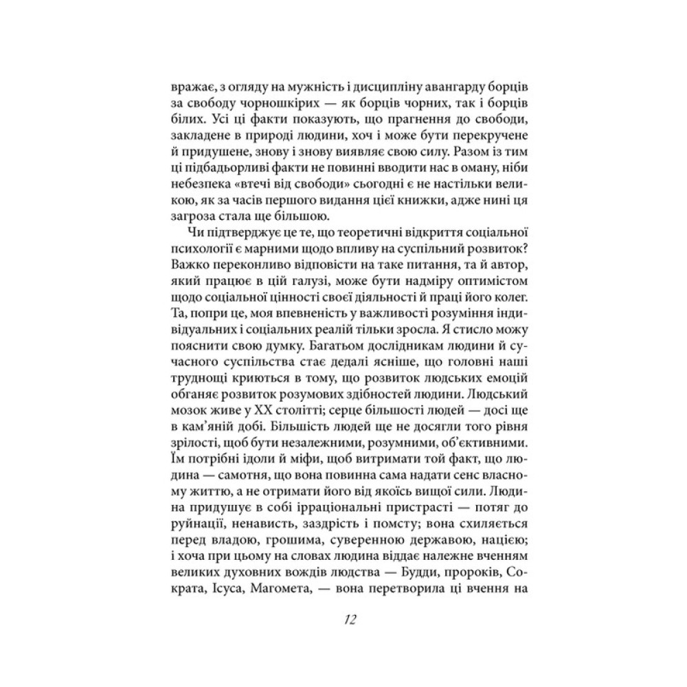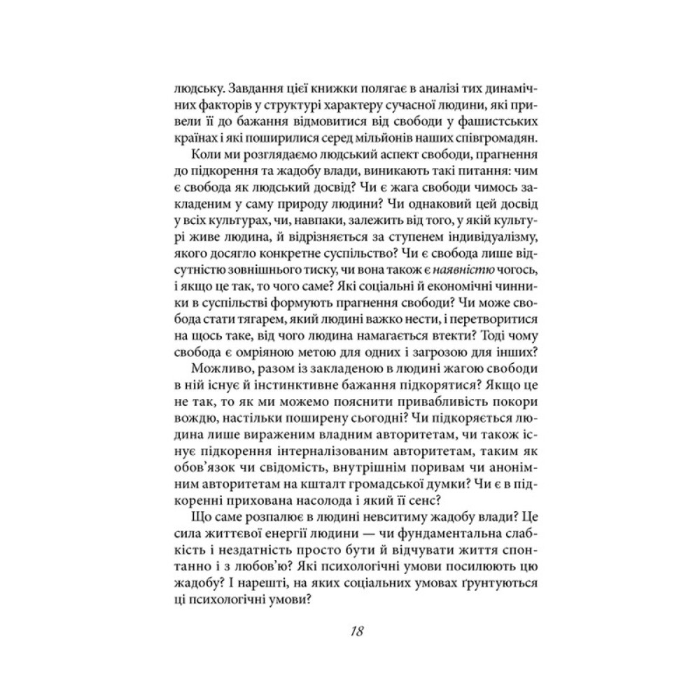 У своїй праці «Втеча від свободи» Еріх Фромм розкриває перед читачем саму суть свободи, чим вона є для сучасної особистості. Чи існує зв’язок між авторитарними режимами та втечею від свободи? Як пояснити той факт, що деякі люди добровільно відмовляються від незалежності, віддаючи перевагу рабству й обираючи конформізм? Чому свобода може спричиняти почуття самотності, страху та безсилля? І чи справді свобода має дві форми — хорошу й погану? Еріх Фромм розглядає феномен свободи і відповідає на ці одвічні питання.