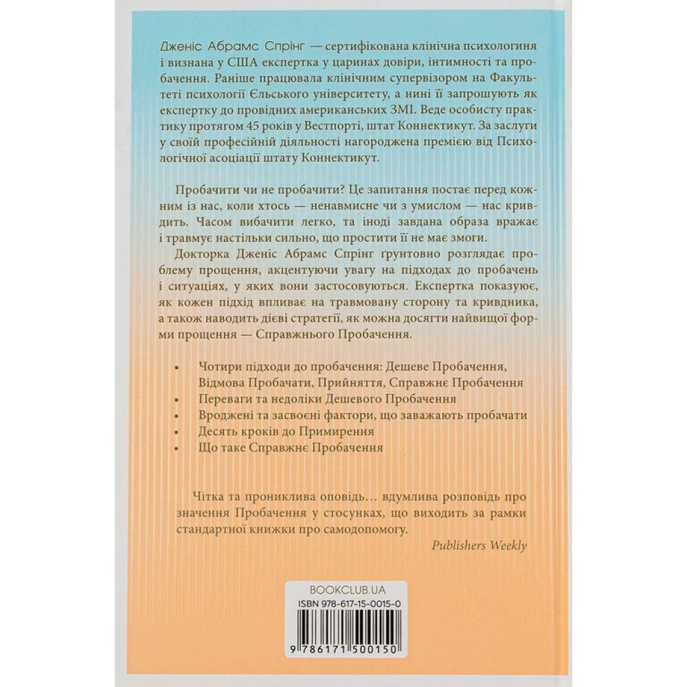 Докторка Дженіс Абрамс Спрінг ґрунтовно розглядає проблему прощення, акцентуючи увагу на підходах до пробачень і ситуаціях, у яких вони застосовуються. Експертка показує, як кожен підхід впливає на травмовану сторону та кривдника, а також наводить дієві стратегії, як можна досягти найвищої форми прощення — «Справжнього Пробачення».