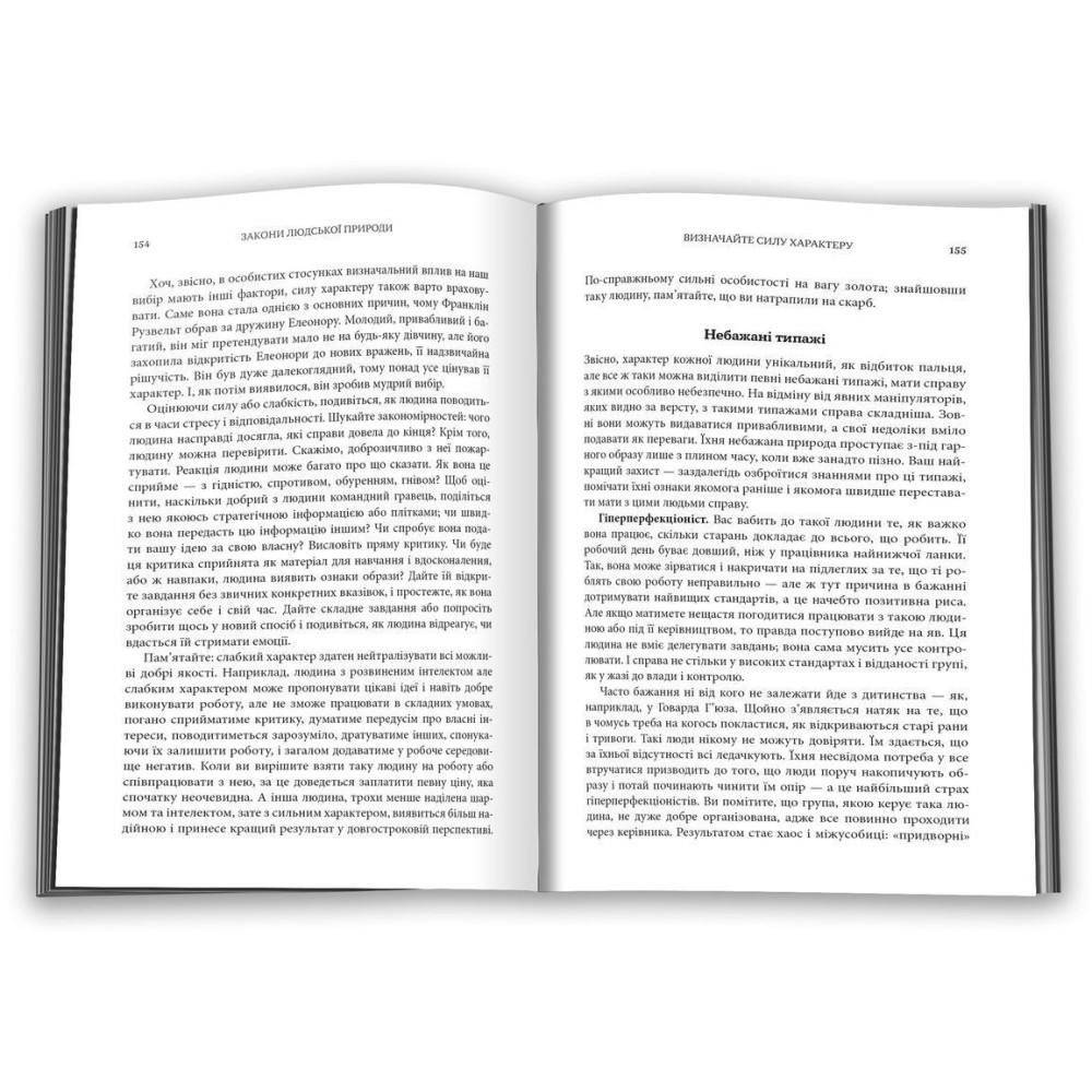 Спираючись на ідеї Перікла, королеви Єлизавети I, Мартіна Лютера Кінга-молодшого й багатьох інших видатних постатей та досліджуючи їхній життєвий шлях, Роберт Ґрін у своїй книзі «Закони людської природи» докладно розповідає, як відсторонитися від власних емоцій та оволодіти самоконтролем, як виробити в собі емпатію, що допомагає глибше розуміти людей, як навчитися зазирати під маски й уникати конформізму, завжди пам’ятаючи про своє призначення.