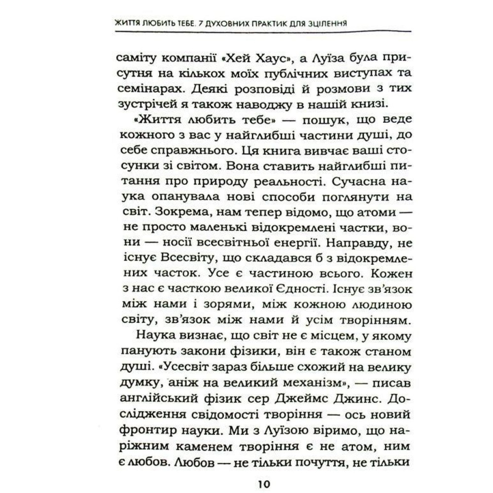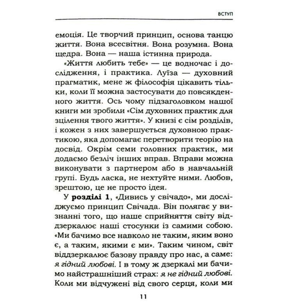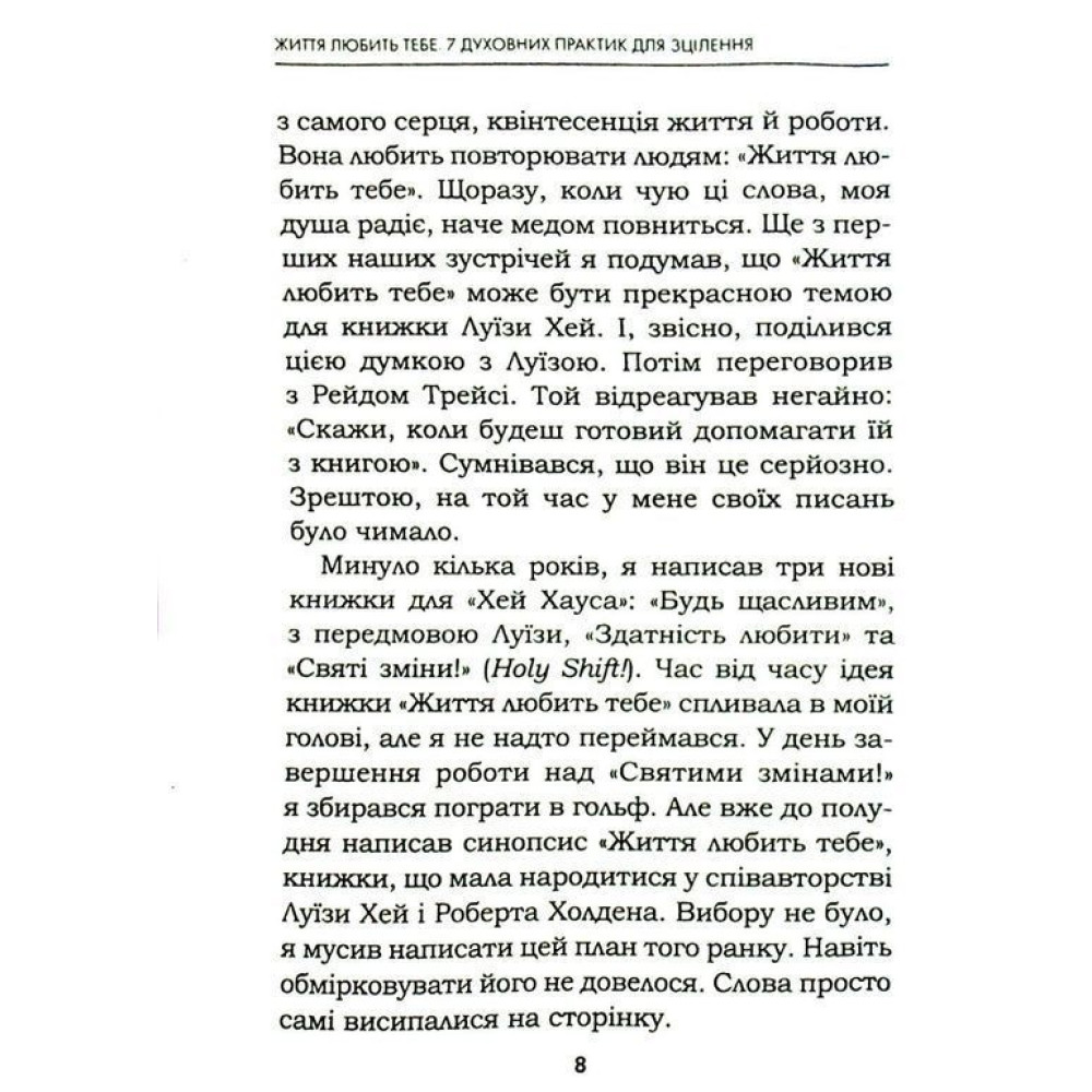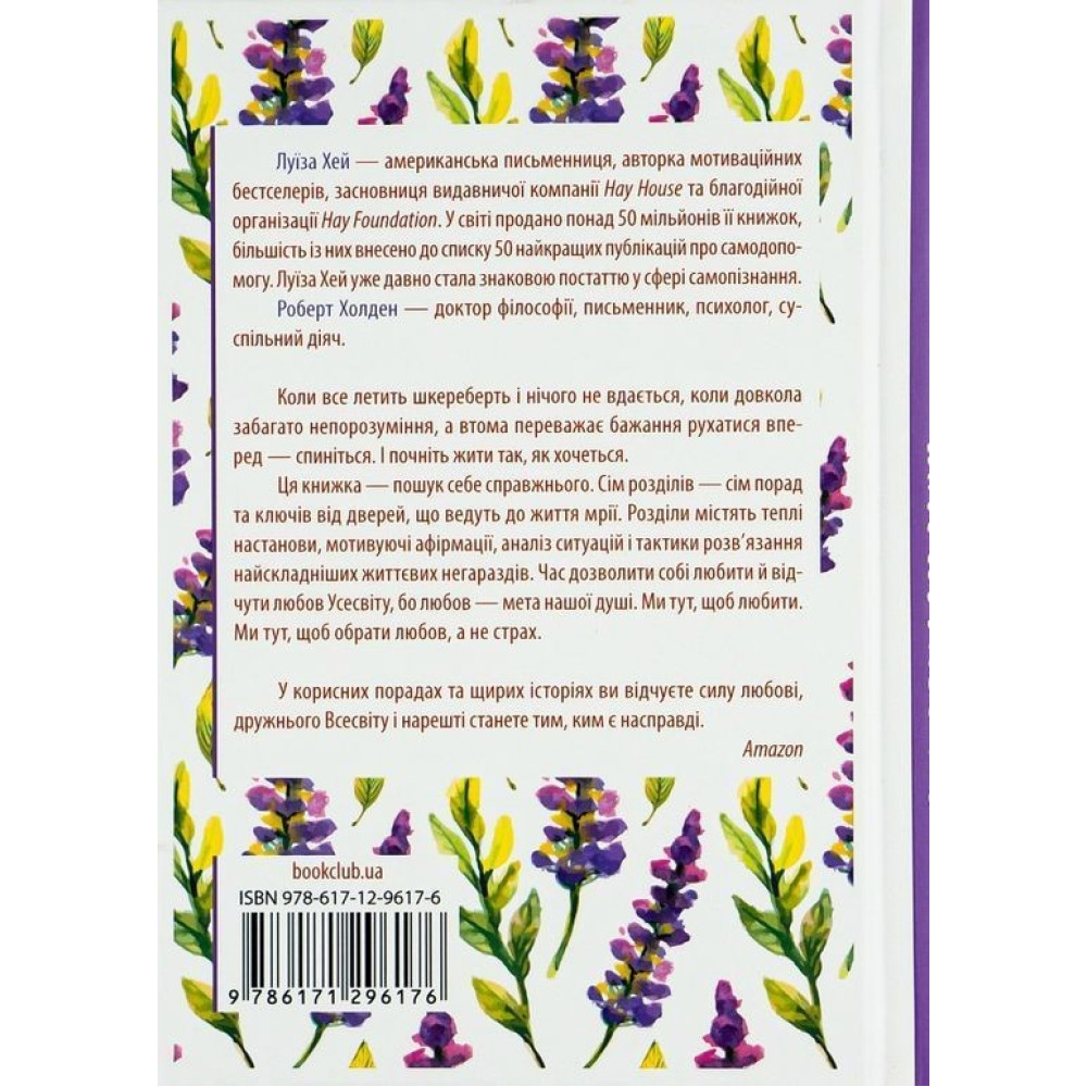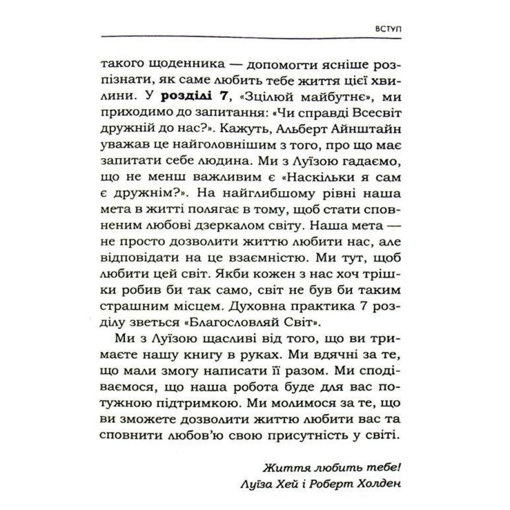 Книжка «Життя любить тебе. 7 духовних практик для зцілення твого життя» від Луїзи Хей і Роберта Холдена — це буквально пошук, що веде кожного з нас у найглибші частини душі, до себе справжнього. Кожен із семи розділів — це сім порад та ключів від дверей, що ведуть до життя мрії. Розділи містять теплі поради, мотивуючі афірмації, аналіз ситуацій та тактики вирішення найскладніших життєвих негараздів. Час дозволити собі любити і відчути любов Усесвіту. Бо любов — мета нашої душі. Ми тут, щоб любити світ. Ми тут, щоб обрати любов, а не страх.